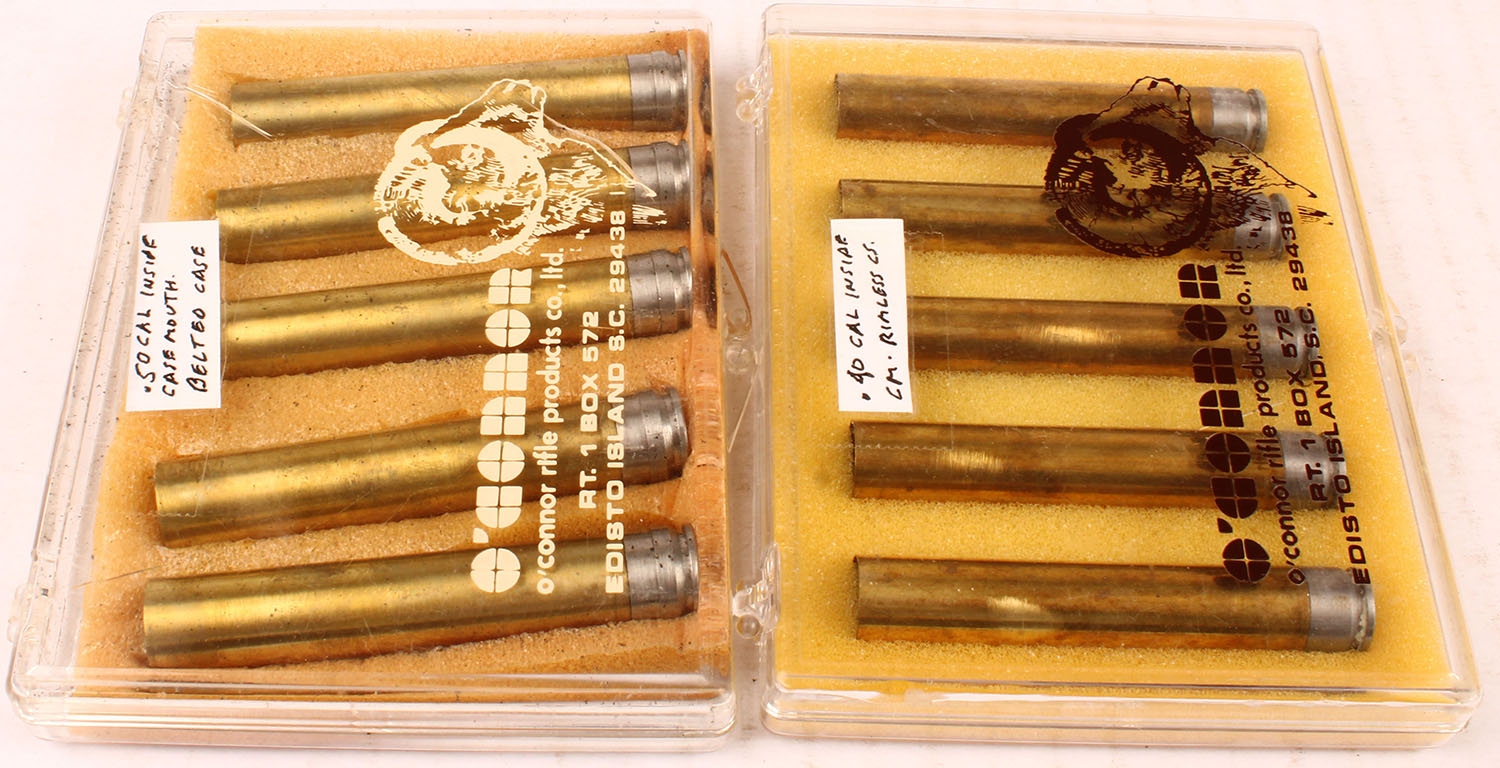 Lot of two, experimental cartridges, .50 cal & .40 cal, 10 Rds. In total, brass cases with steel case heads, no H/S, shells are excellent. Grade: Excellent - Value: 10 to 30
