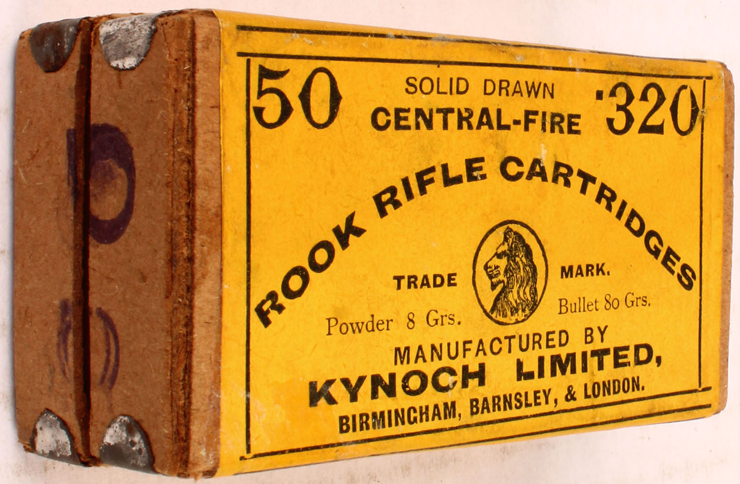 Kynoch Limited, .320 Rook, 80 Gr. Bullet, 2pc, Full, buff box with yellow label & black print, box is solid with light rub marks & light age soiling, ammo is very good. Grade: Excellent - Value: 50 to 100