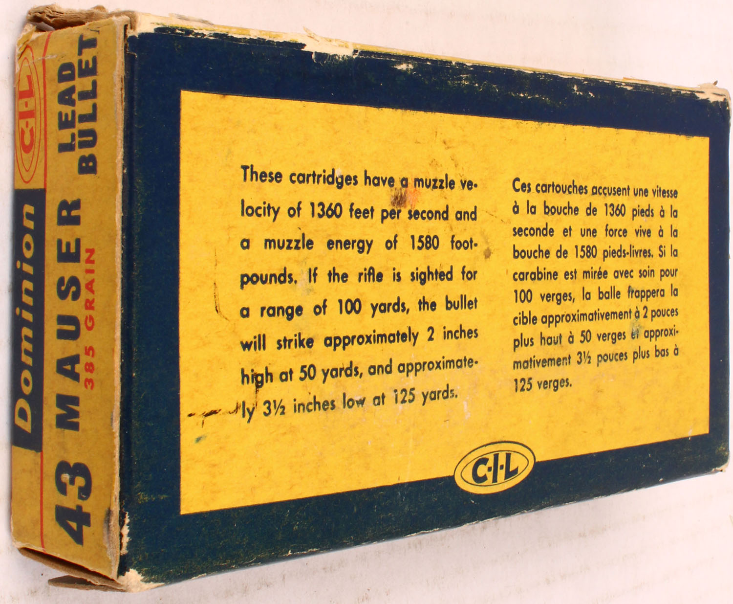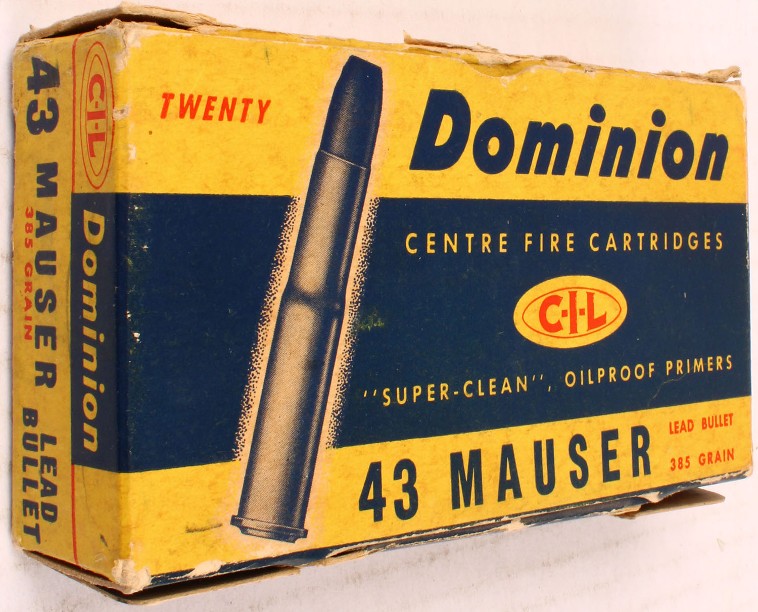 Dominion, .43 Mauser, Smokeless, Lead Bullet, 1pc, Partial 14 Rds., yellow box with blue label & white/blue print, box is solid with one inside flap missing, tape, light rub marks, edge wear, & light age soiling ammo is very good. Grade: Very Good ++ - Value: 20 to 60