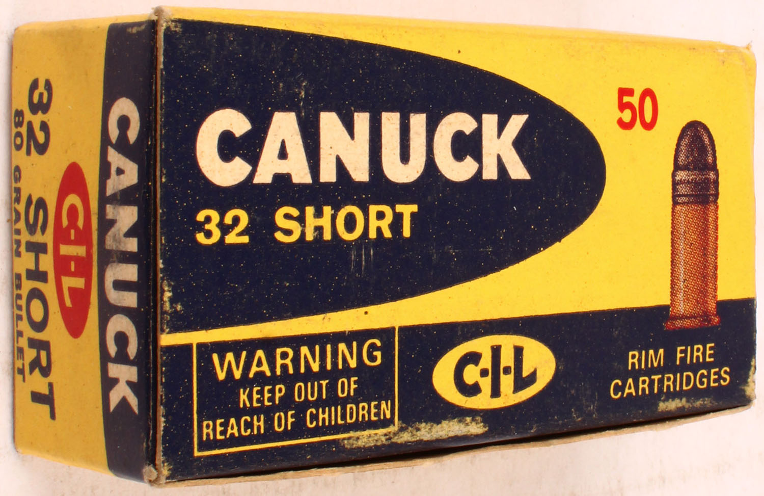 C-I-L, Canuck, .32 Short, 80 Gr. Bullet, 1pc, Full, yellow box with blue label & white/yellow print, box is solid with handling wear, & light age soiling, ammo is very good. Grade: Excellent - Value: 100 to 200