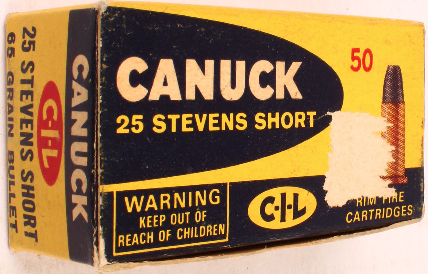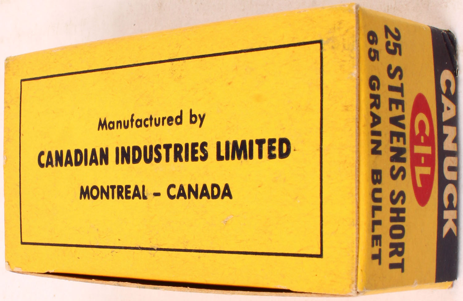 C-I-L, Canuck, .25 Stevens Short, 65 Gr. Bullet, 1pc, Full, yellow box with blue label & white/yellow print, box is solid with sticker tear mark, & light rub wear, ammo is Excellent. Grade: Very Good ++ - Value: 80 to 160