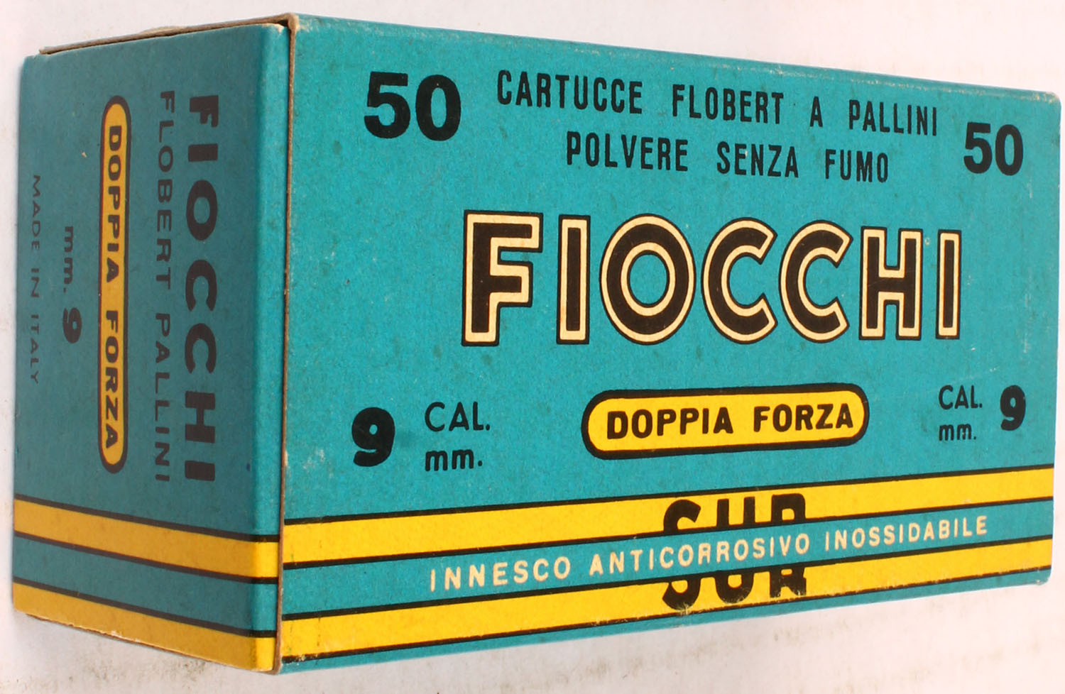 Fiocchi, 9mm R.F., smokeless, 1pc, Full, blue box with yellow/black print, box is solid with light rub marks, ammo is excellent. Grade: Excellent ++ - Value: 30 to 60