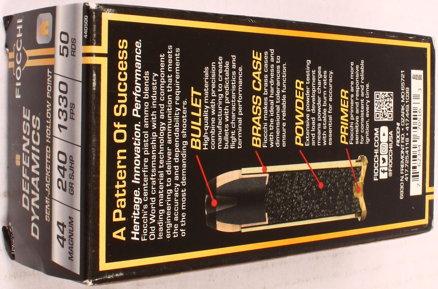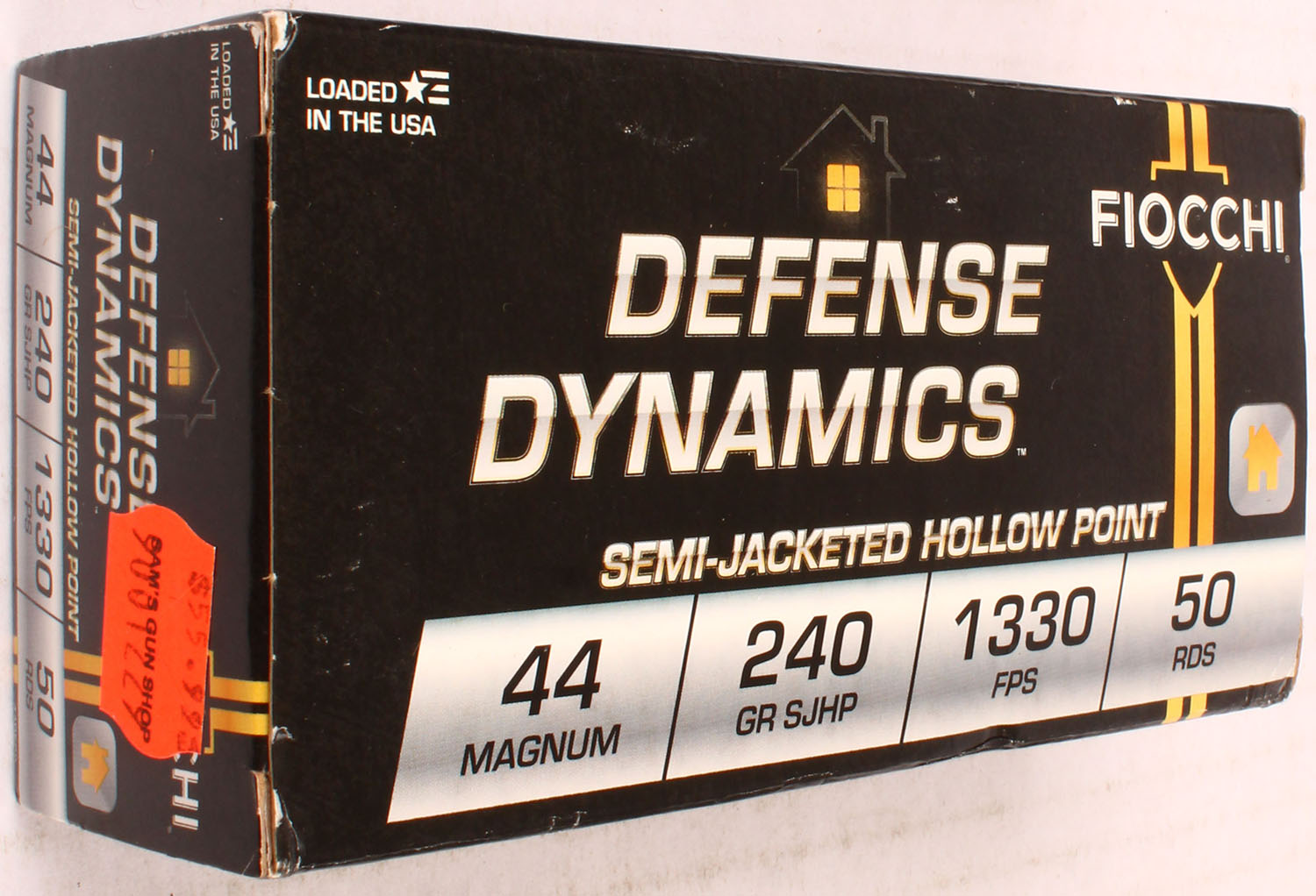 Fiocchi, Defense Dynamics, .44 Mag, 240 Gr. SJHP, 1pc, Full, black box with gold/gray/black print, box is solid with handling wear, ammo is MINT. Grade: Excellent ++ - Value: 40 to 80