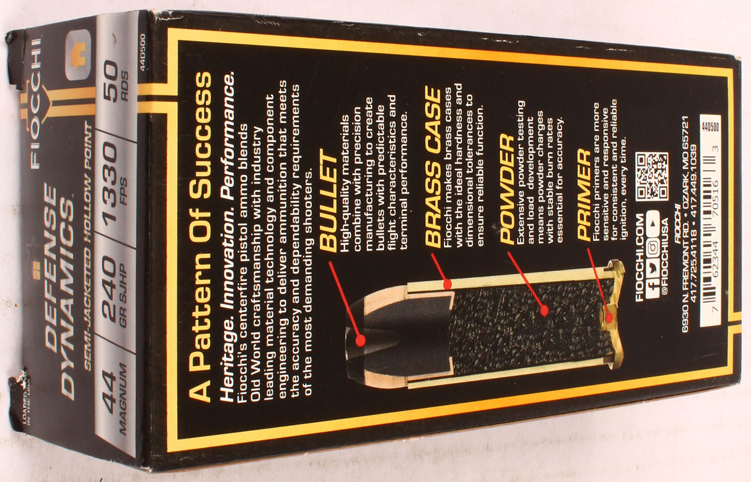 Fiocchi, Defense Dynamics, .44 Mag, 240 Gr. SJHP, 1pc, Full, black box with gold/gray/black print, box is solid with handling wear, ammo is MINT. Grade: Excellent ++ - Value: 40 to 80