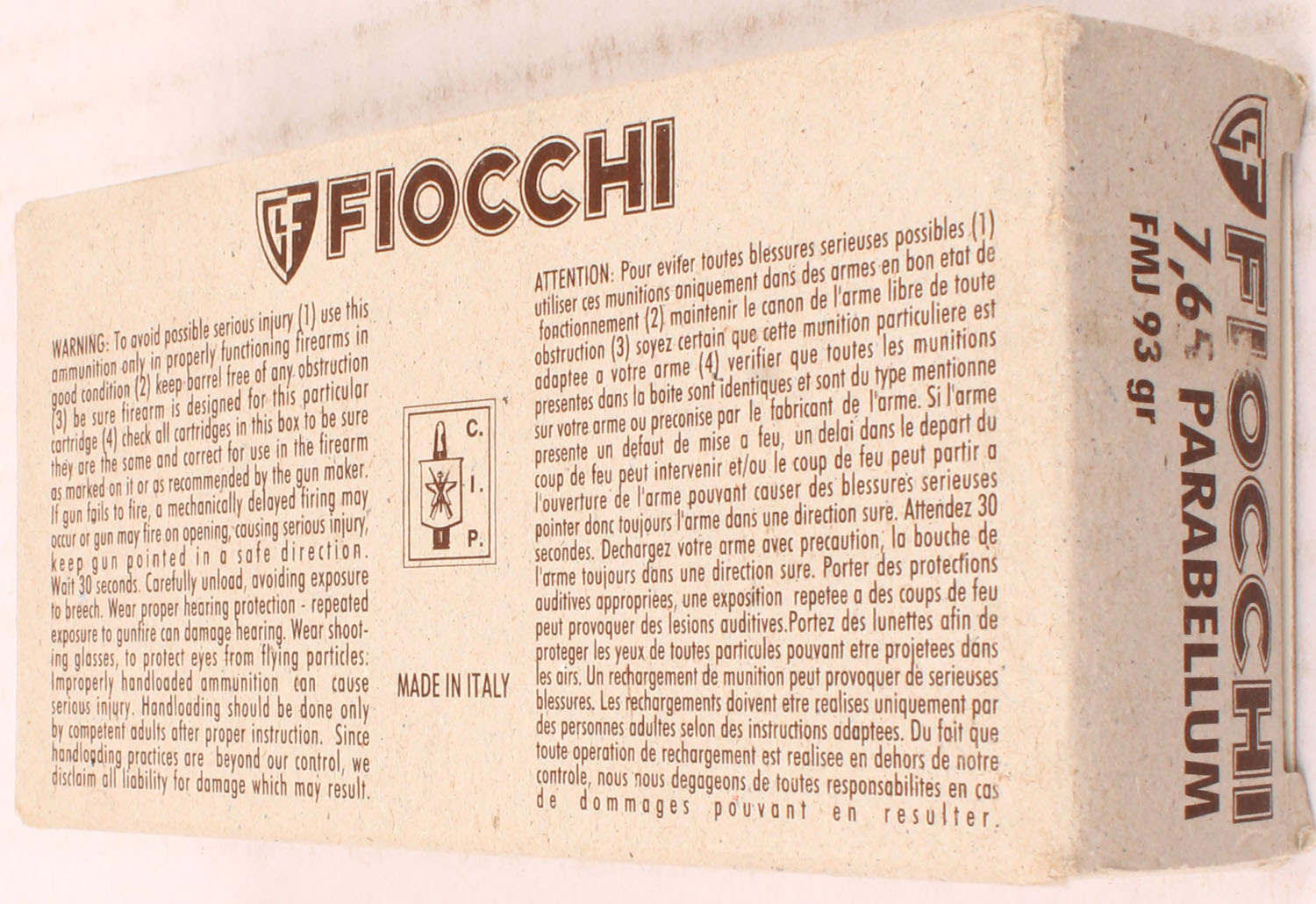 Fiocchi, 7.65 Parabellum, 93 Gr. FMJ Bullet, 1pc, Full, gray box with brown label & white/brown print, box is solid with light wear ammo is MINT. Grade: Excellent ++ - Value: 30 to 60