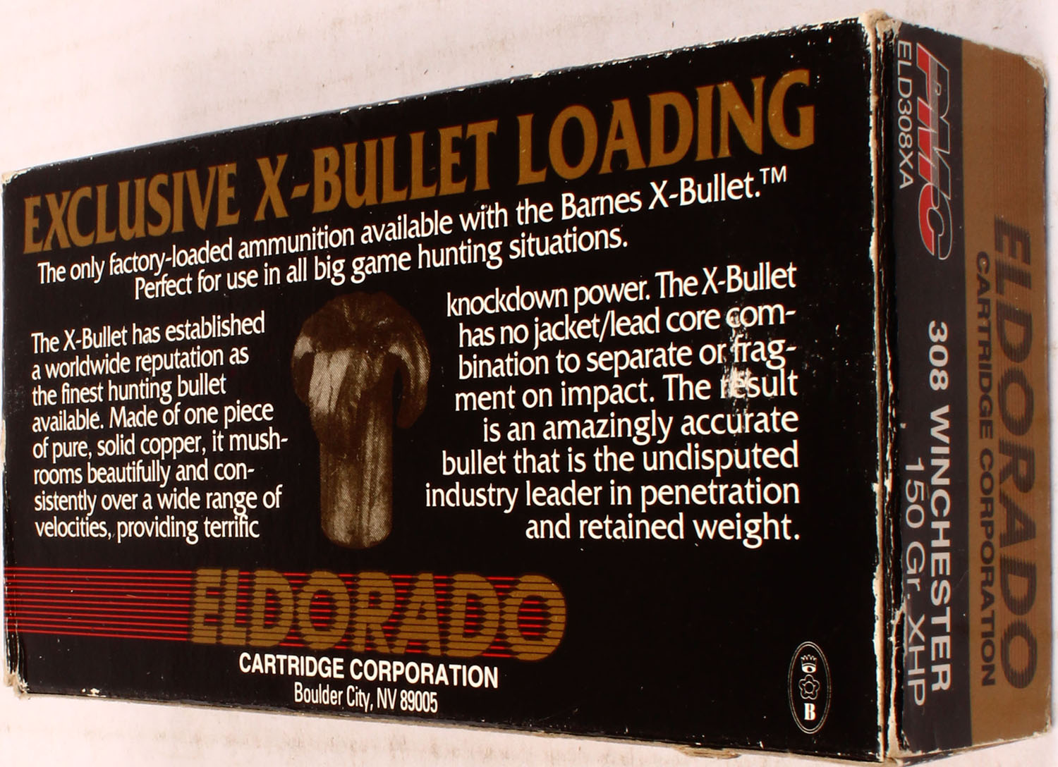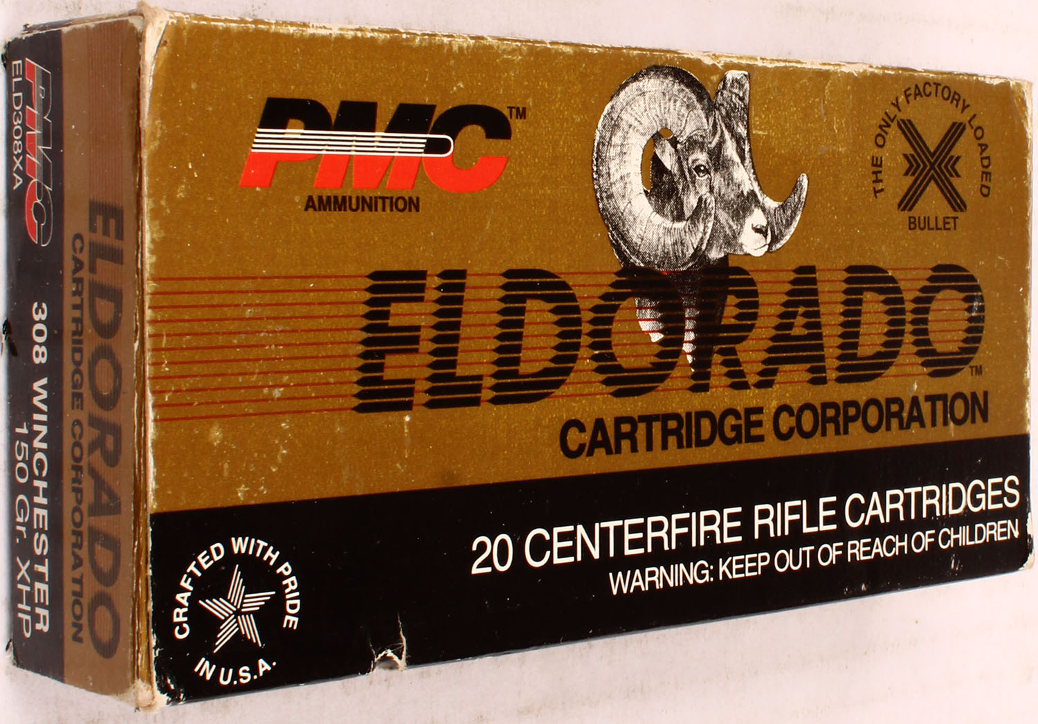 PMC, Eldorado, .308 Winchester, 150 GR. XHP bullet, 1pc, Full, black/gold box with black/white/red print, box is solid with light rub marks, & light edge/corner wear, ammo is excellent. Grade: Excellent - Value: 20 to 40