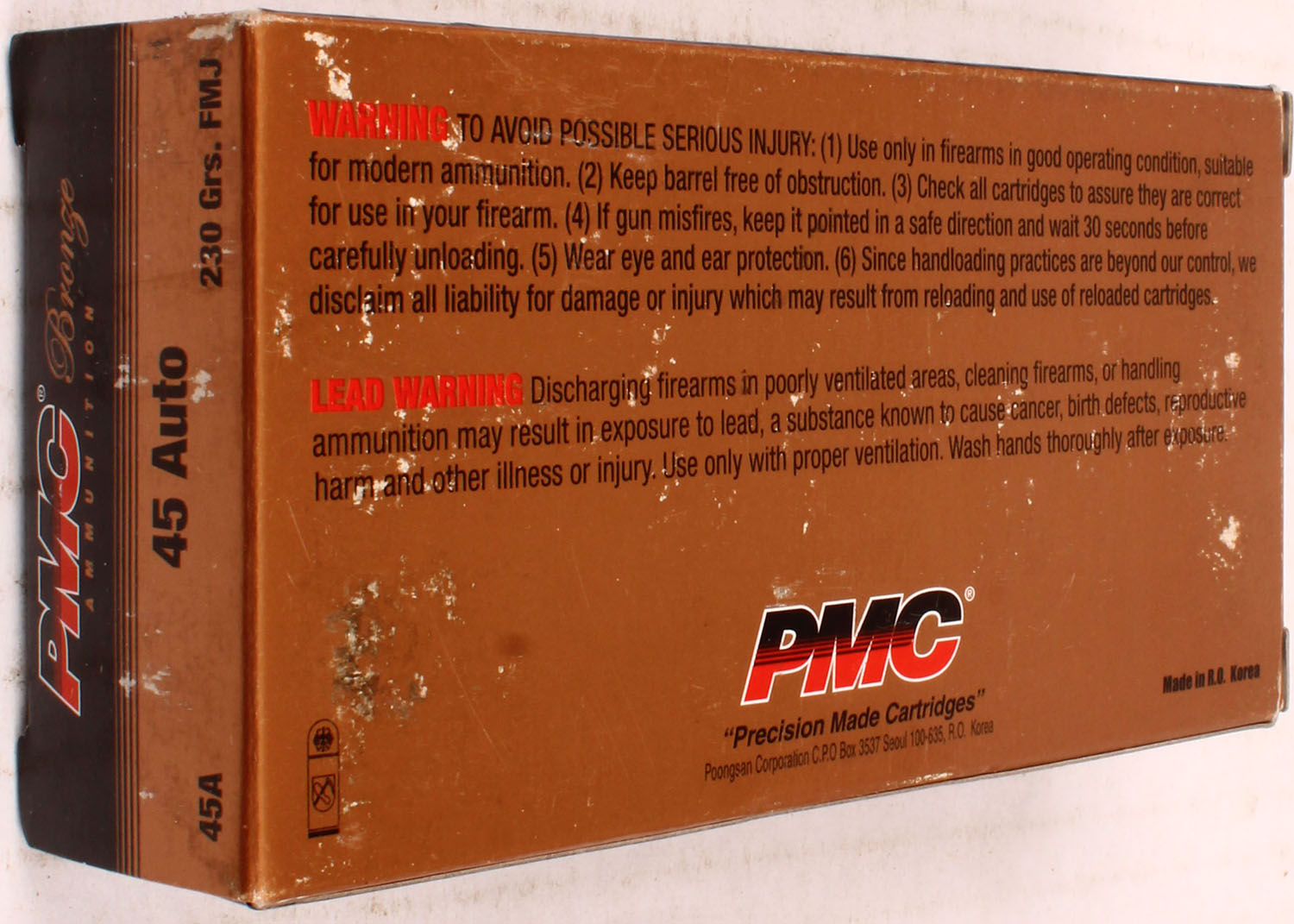 PMC, Bronze, .45 Auto, 230 Gr. FMJ bullet, 1pc, Full, black/bronze box with black/bronze/red print, box is solid with light rub wear, ammo is excellent. Grade: Excellent ++ - Value: 30 to 60