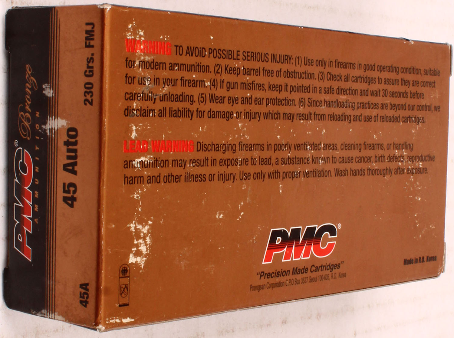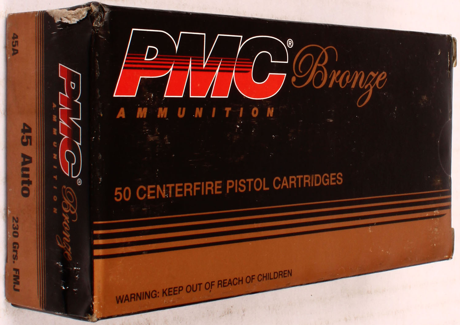 PMC, Bronze, .45 Auto, 230 Gr. FMJ bullet, 1pc, Full, black/bronze box with black/bronze/red print, box is solid with light rub wear, ammo is excellent. Grade: Excellent ++ - Value: 30 to 60