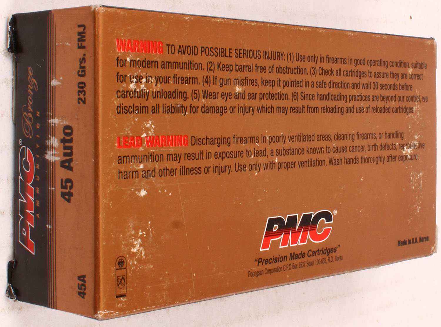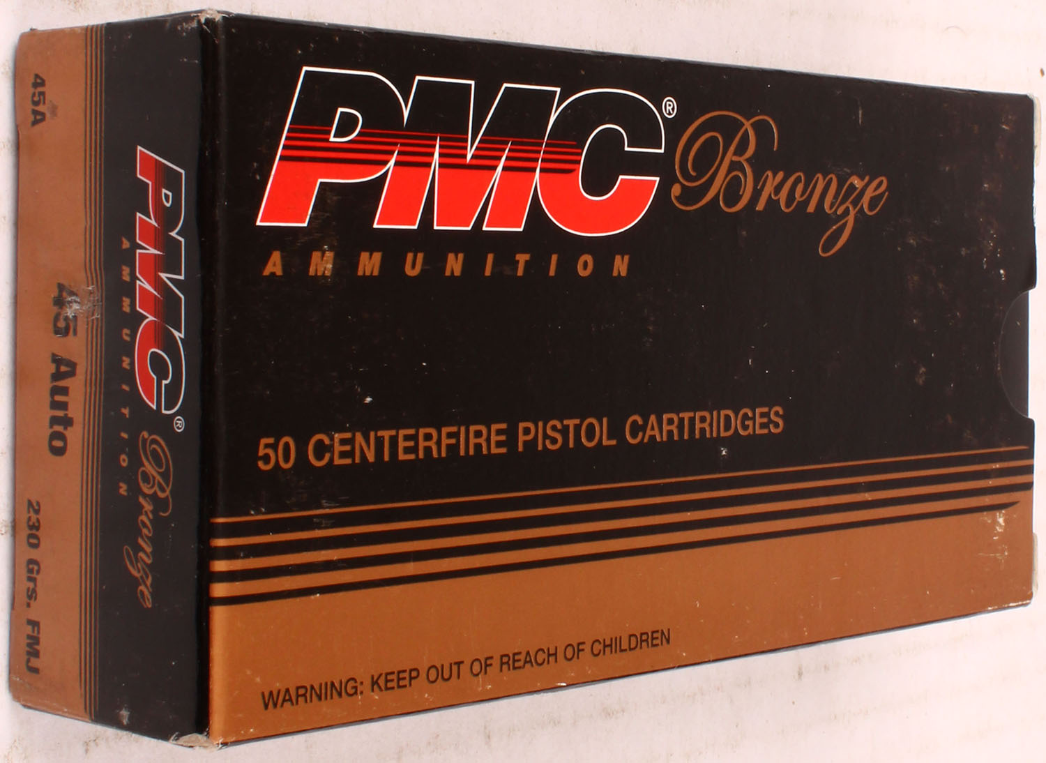 PMC, Bronze, 45 auto, 230 Grain FMJ, Full, 1pc., multi-colored box, box is solid with excellent color, Ammo is excellent. Grade: Excellent ++ - Value: 20 to 60