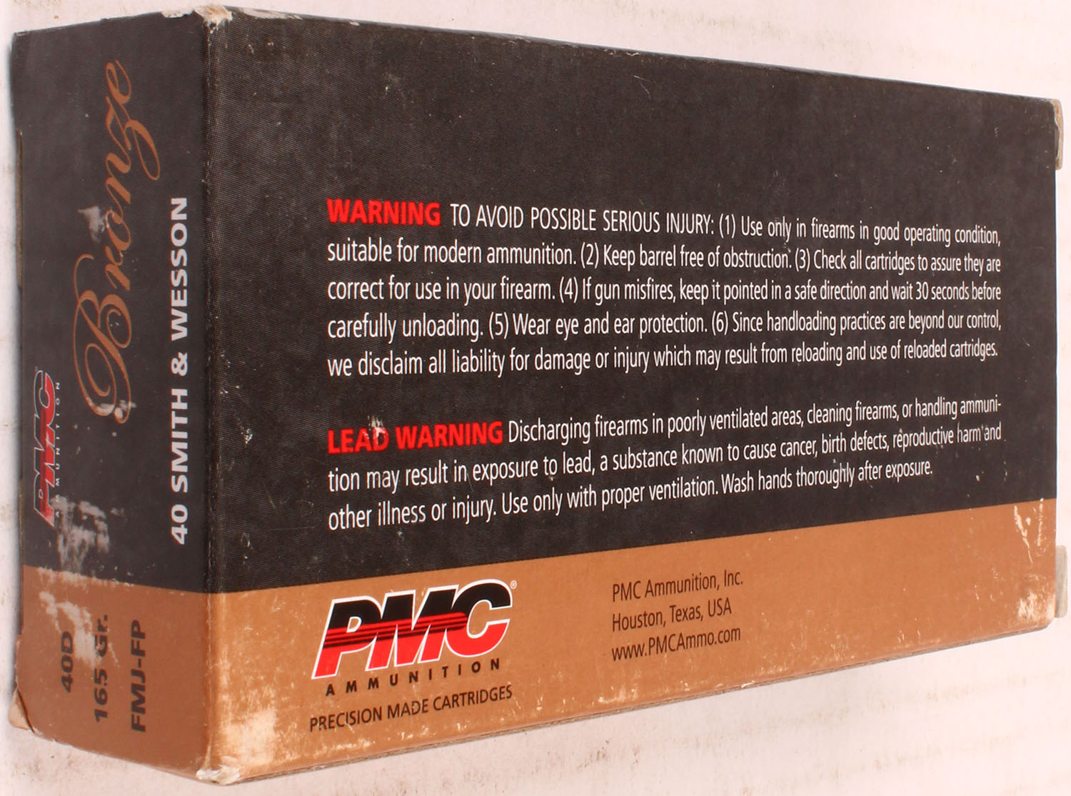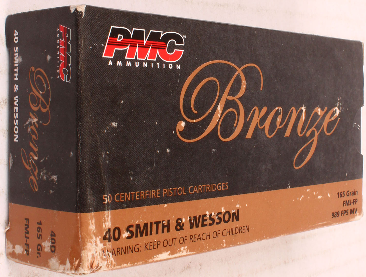 PMC, Bronze, 40 Smith & Wesson, 165 Grain FMJ-FP, Full, 1pc., multi-colored box, box is solid with excellent color, Ammo is excellent. Grade: Excellent ++ - Value: 20 to 60