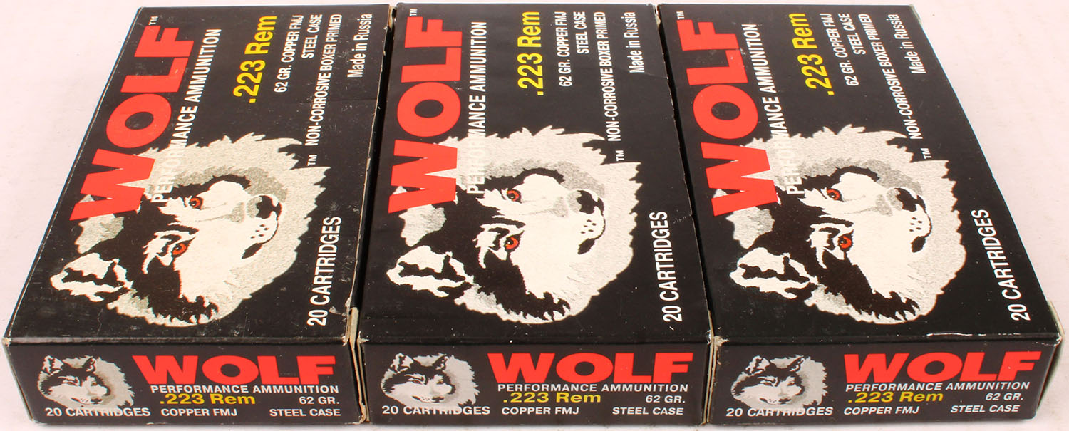 Lot of 3 Wolf, 223 Rem, 62 Grain Copper FMJ, Full, 1pc., Multi-colored box, box is solid with excellent color, Ammo is excellent. Grade: Excellent - Value: 20 to 60