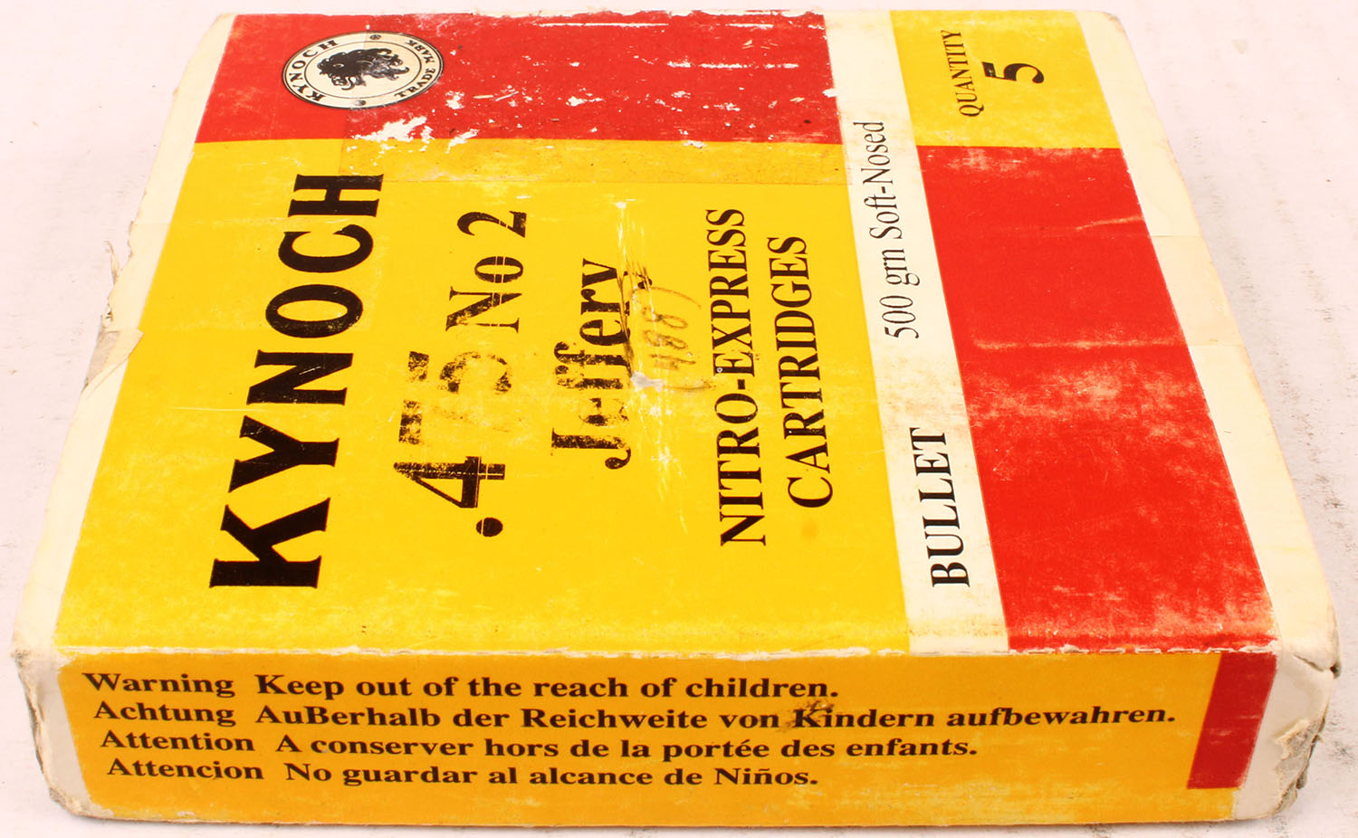 Kynoch, 475 No.2 Jeffery, 500 Grains Soft-Nosed, Full, 1pc. Multi-colored box, box is solid with very nice color, Ammo is excellent. Grade: Excellent - Value: 20 to 80