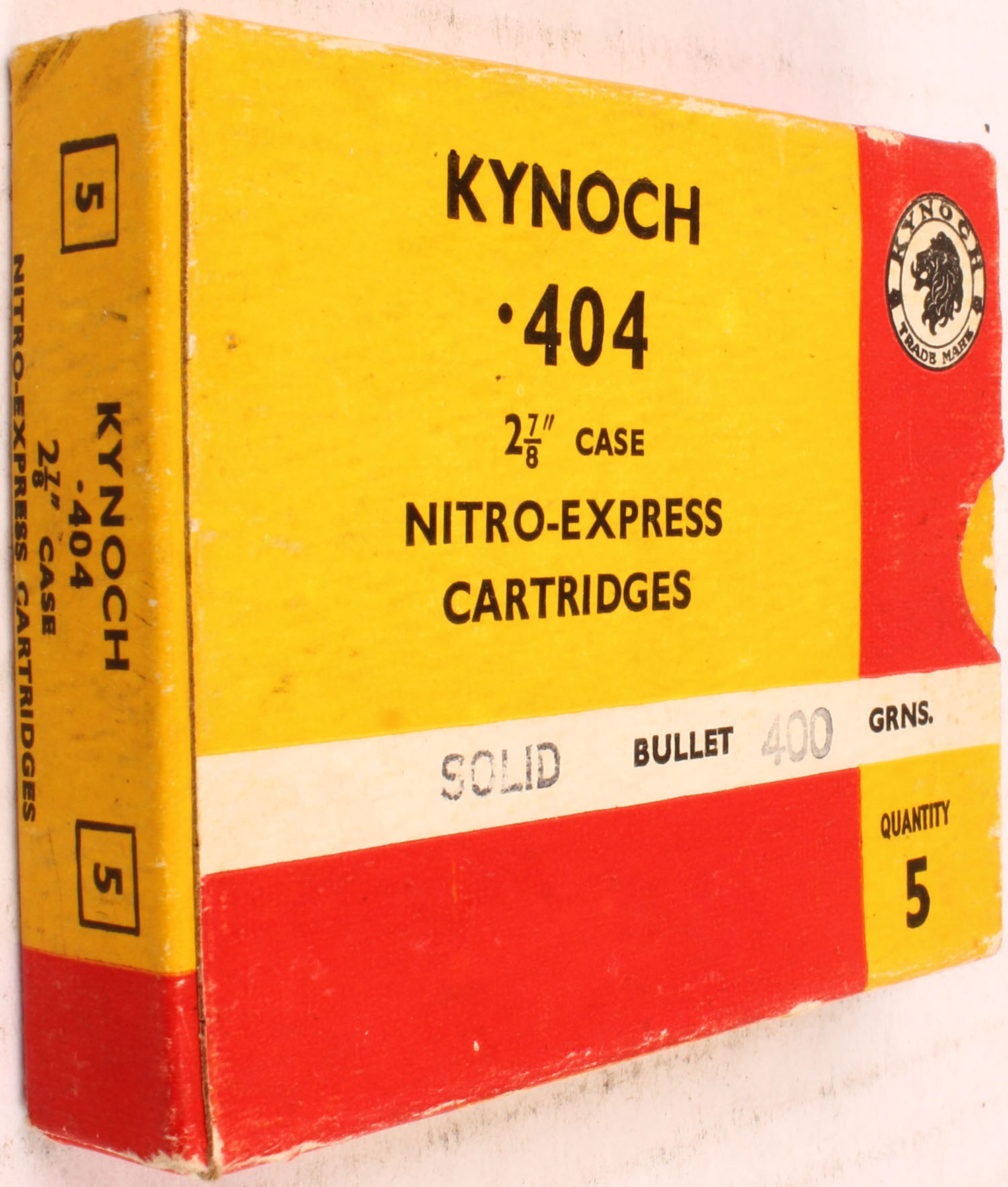 Kynoch, 404 Nitro-Express, 400 Grains Solid Bullet, Full, 1pc. Multi-colored box, box is solid with very nice color, Ammo is very good. Grade: Excellent - Value: 20 to 80