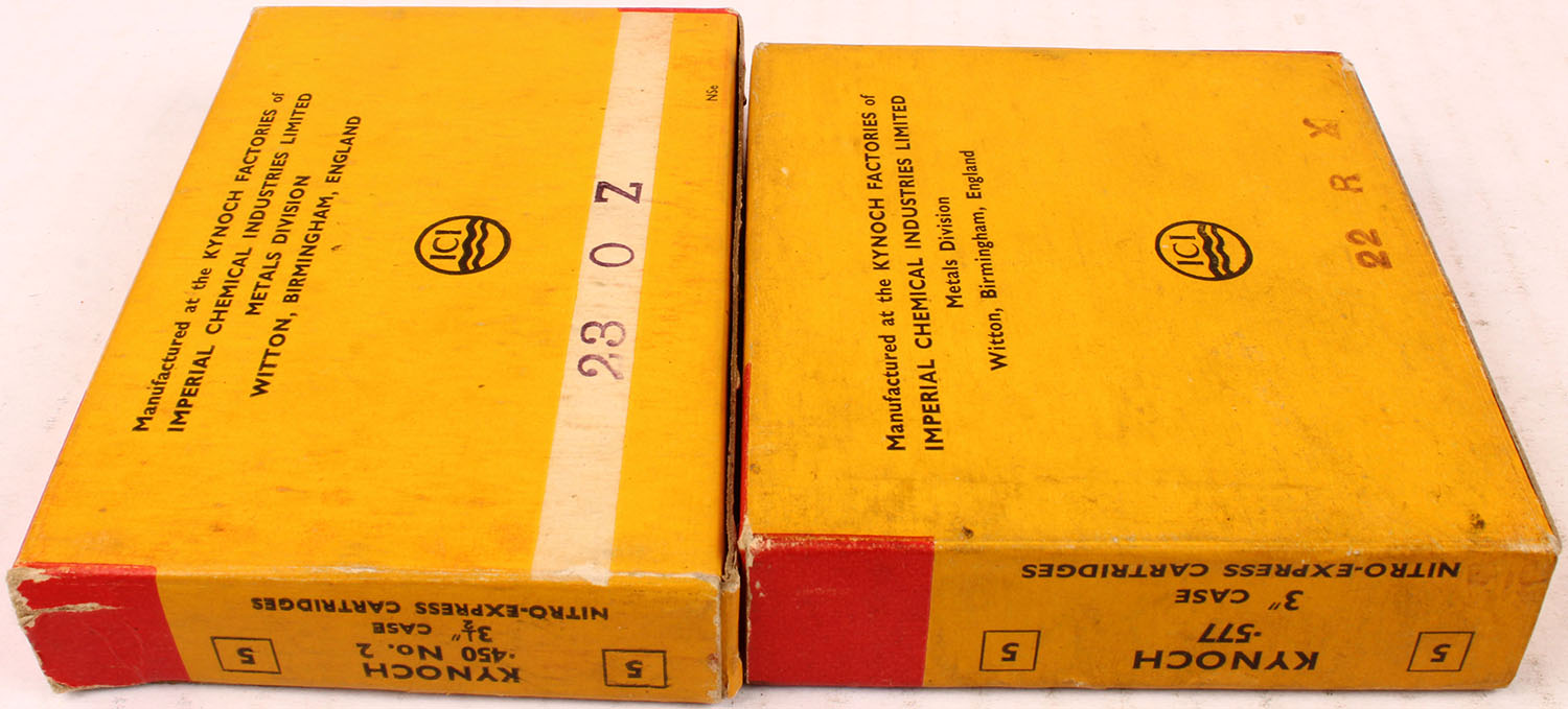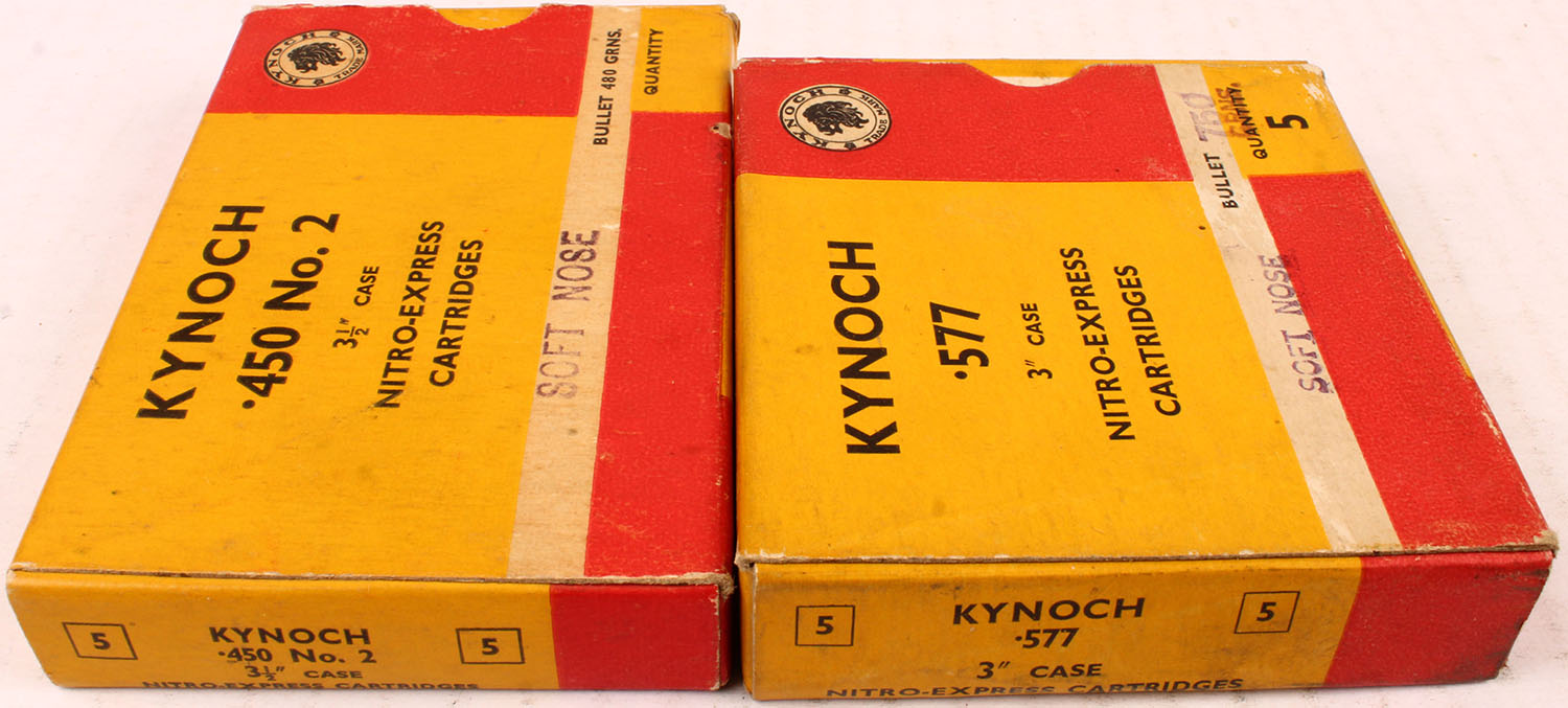 Lot of 2 Kynoch, .577/.450 No.2, 750/480 Grains Soft Nose, Full/Partial 4rds., 1pc. Multi-colored box, box is solid with excellent color, Ammo is excellent. Grade: Excellent - Value: 20 to 80