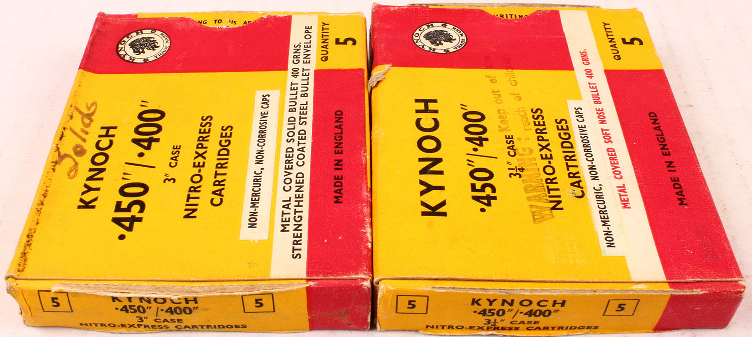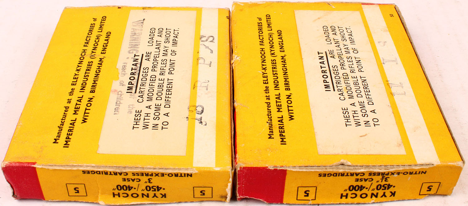 Lot of 2 Kynoch, 450/400, 400 Grains Metal Covered Solid/Soft Nose, Full/Partial 4rds., 1pc. Multi-colored box, box is solid with excellent color, Ammo is excellent. Grade: Excellent - Value: 20 to 80