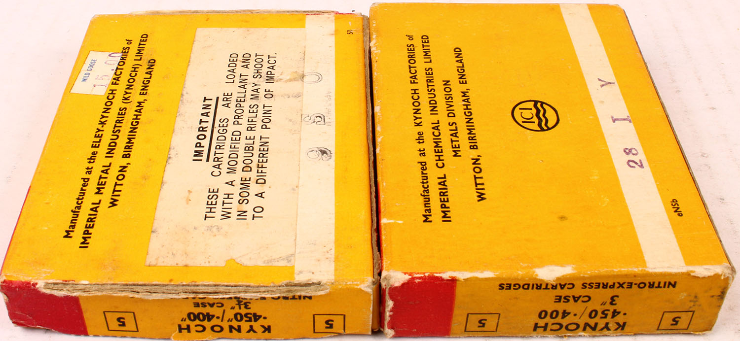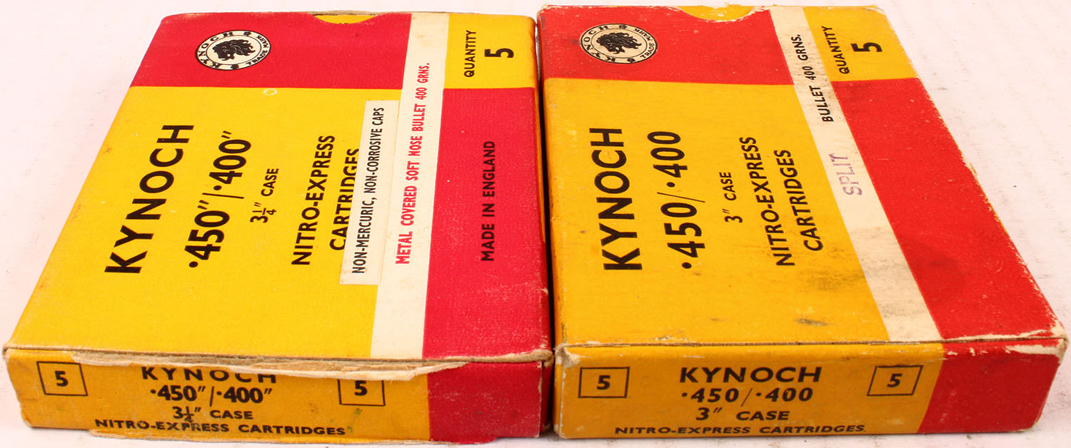 Lot of 2 Kynoch, 450/400, 400 Grains Metal Covered Soft Nose/Split, both are Partial 4rds., 1pc., Multi-colored box, box is solid with excellent color, Ammo is excellent. Grade: Very Good ++ - Value: 10 to 60