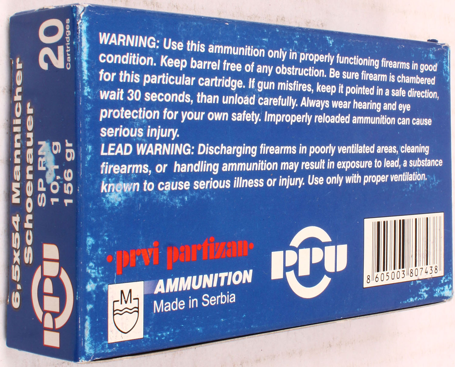 PPU, 6.5x54 Mannlicher Schoenauer, 156 Grain SP RN, Full, 1pc. Multi-colored box, box is solid with excellent color, Ammo is excellent. Grade: Excellent + - Value: 20 to 60