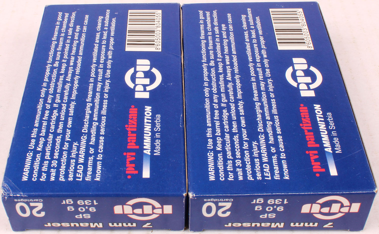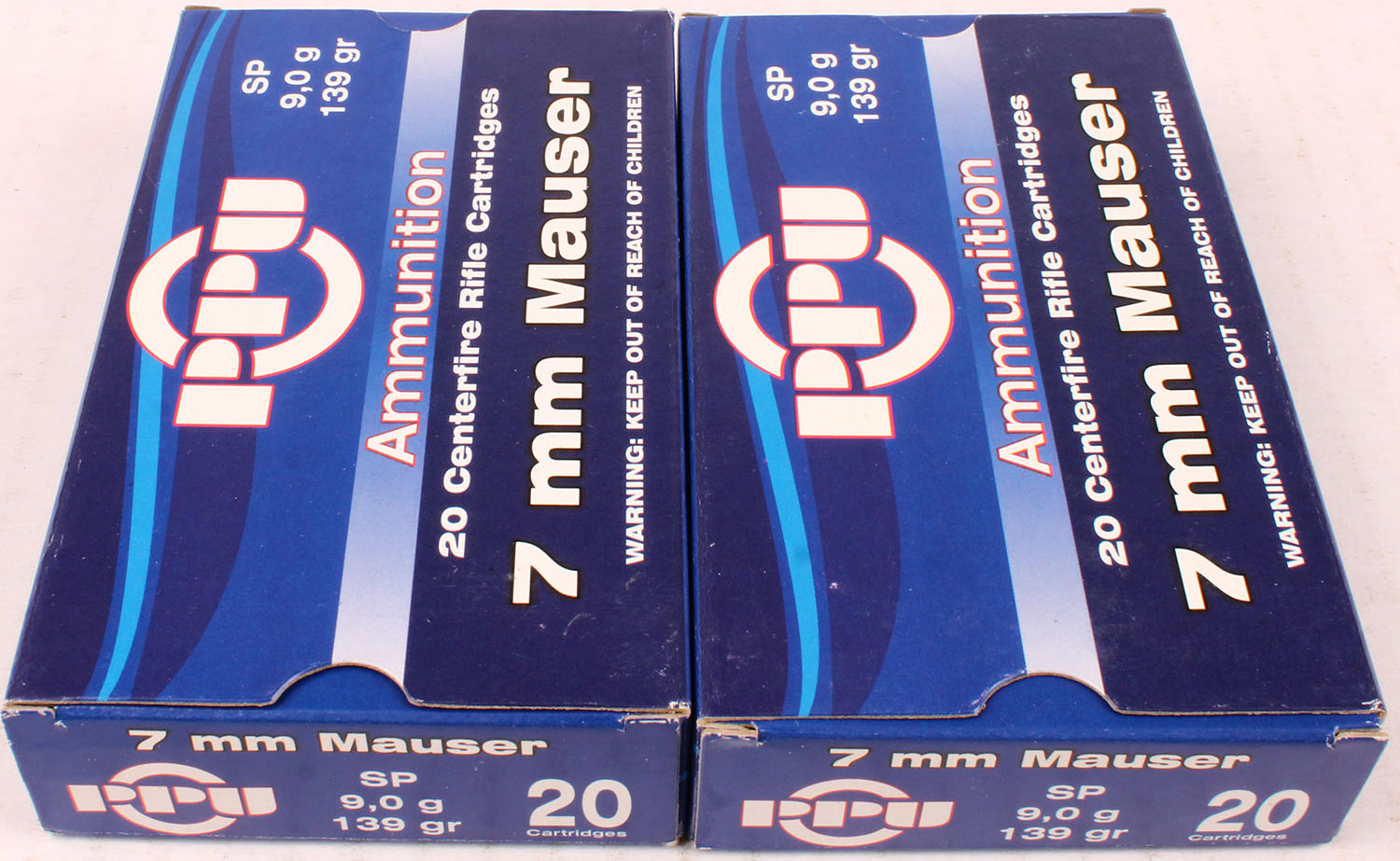 Lot of 2 PPU, 7mm Mauser, 139 Grain SP, Full, 1pc. Multi-colored box, box is solid with excellent color, Ammo is excellent. Grade: Excellent + - Value: 20 to 60