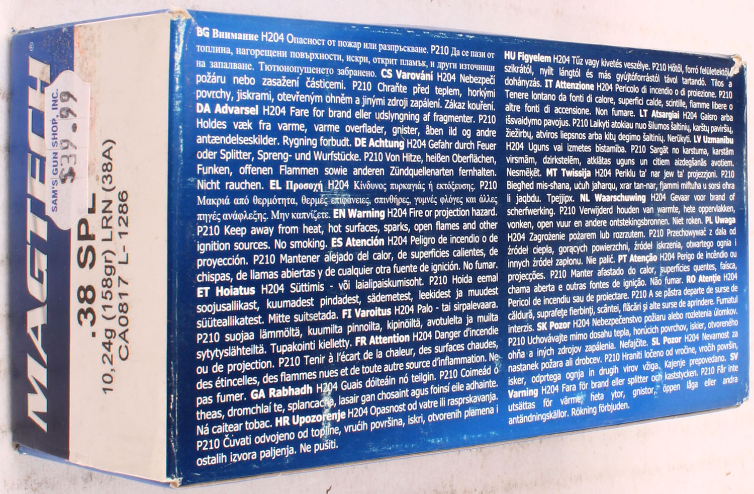 Magtech, 38 SPL, 158 Grain LRN, Full, 1pc. Multi-colored box, box is solid with excellent color, Ammo is excellent. Grade: Excellent + - Value: 20 to 60
