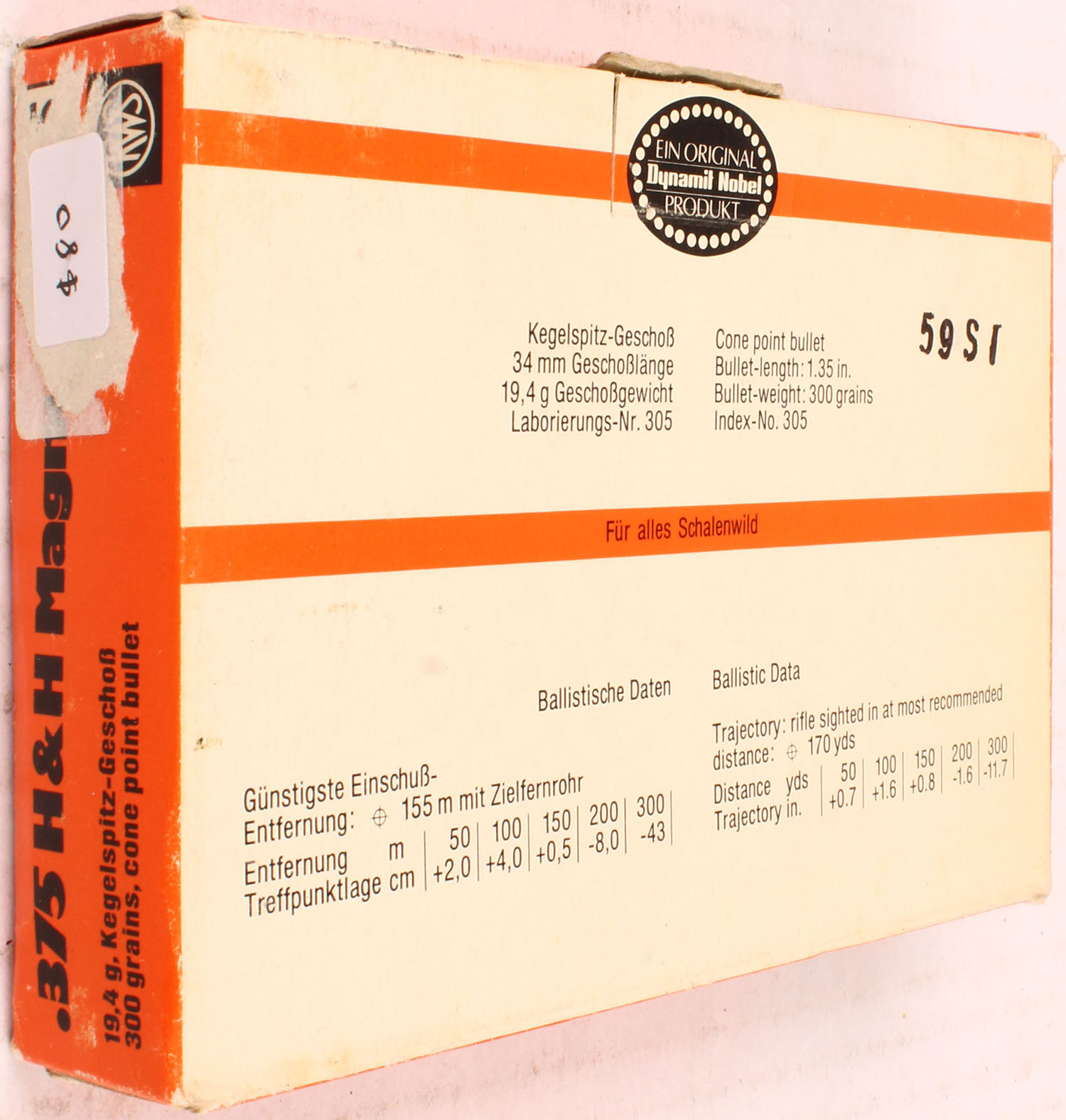 RWS, 375 H&H Mag, 300 Grain Cone Point Bullet, Full, 1pc. Multi-colored box, box is solid, with excellent color, Ammo is excellent. Grade: Excellent - Value: 20 to 80