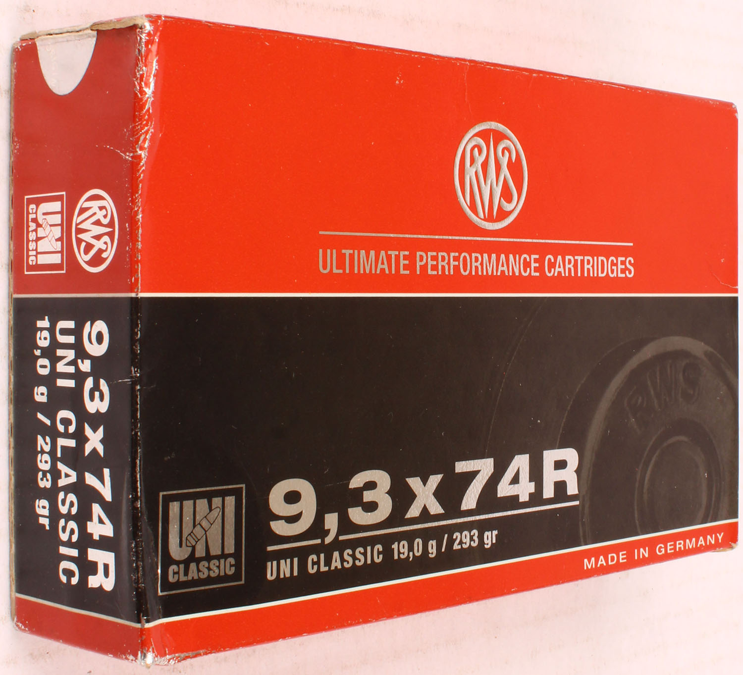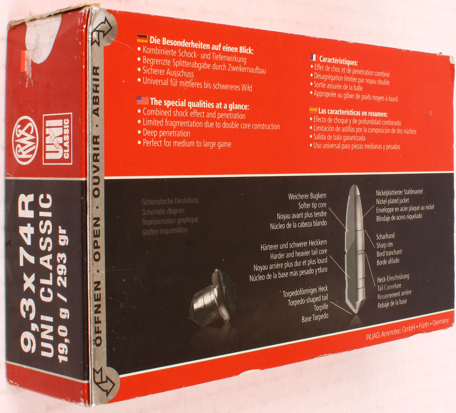 RWS, 9.3x74R, 293 Grain Uni Classic, Full, 1pc. Multi-colored box, box is solid, with excellent color, Ammo is excellent. Grade: Excellent + - Value: 20 to 80