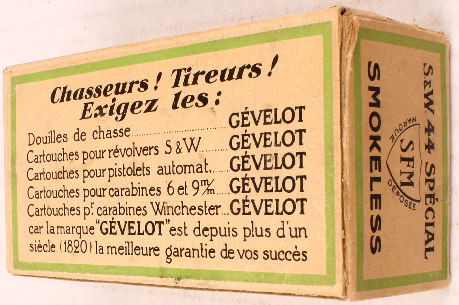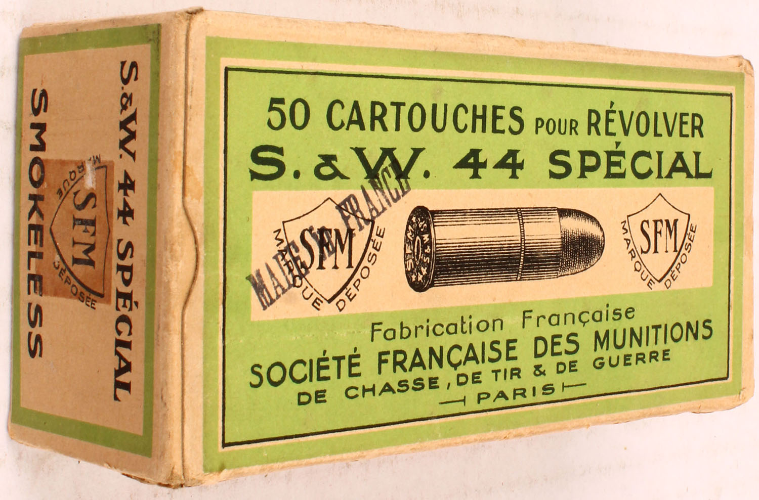 SFM, 44 SPL, Partial 39rds., 1pc. Multi-colored box, box is solid, with excellent color, Ammo is excellent. Grade: Excellent + - Value: 20 to 80