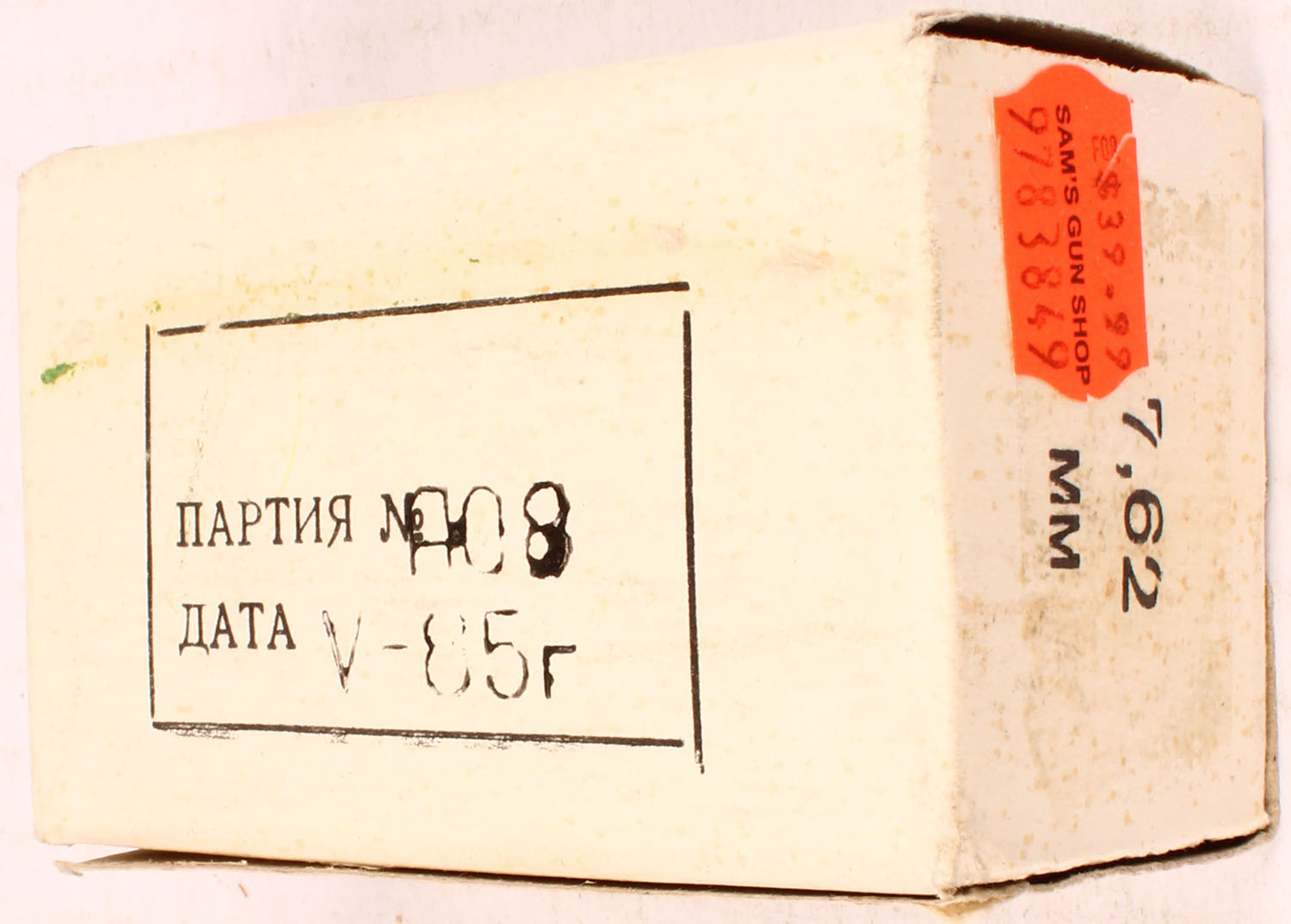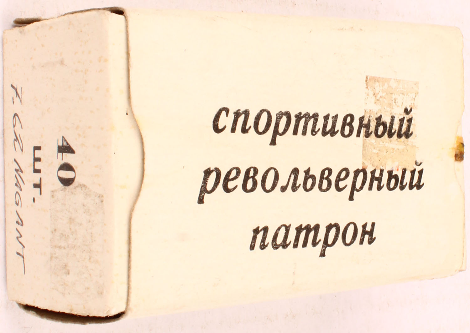 Soviet Mfg'd., 7.62x38mmR, Recessed wad-cutter lead bullet, Full, 1pc. White box with black printing, box is solid with excellent color, some tape & sticker residue, minor corner wear, edges are mostly crisp, end flaps are solid, ammo is excellent. Grade: Excellent - Value: 20 to 60