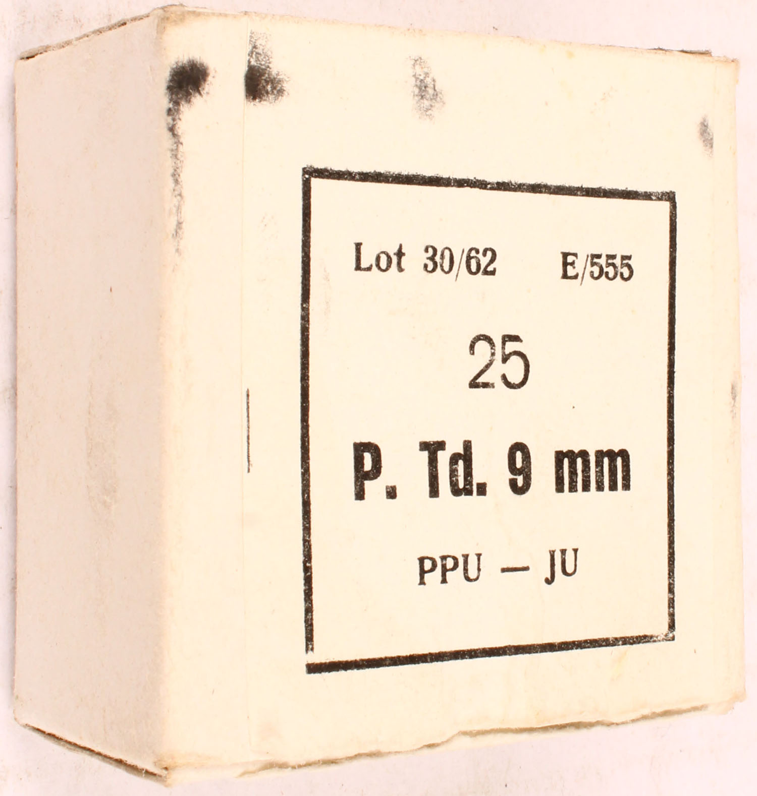 PPU, 9x19mm, Full, 1pc. White box with white & black label, box is solid with excellent color, some age soiling, very minor edge & corner wear, ammo is excellent. Grade: Excellent - Value: 10 to 40