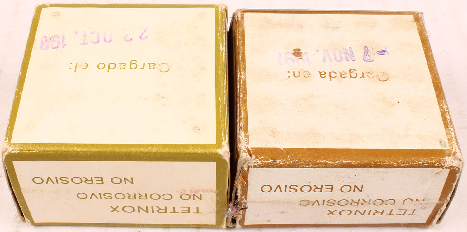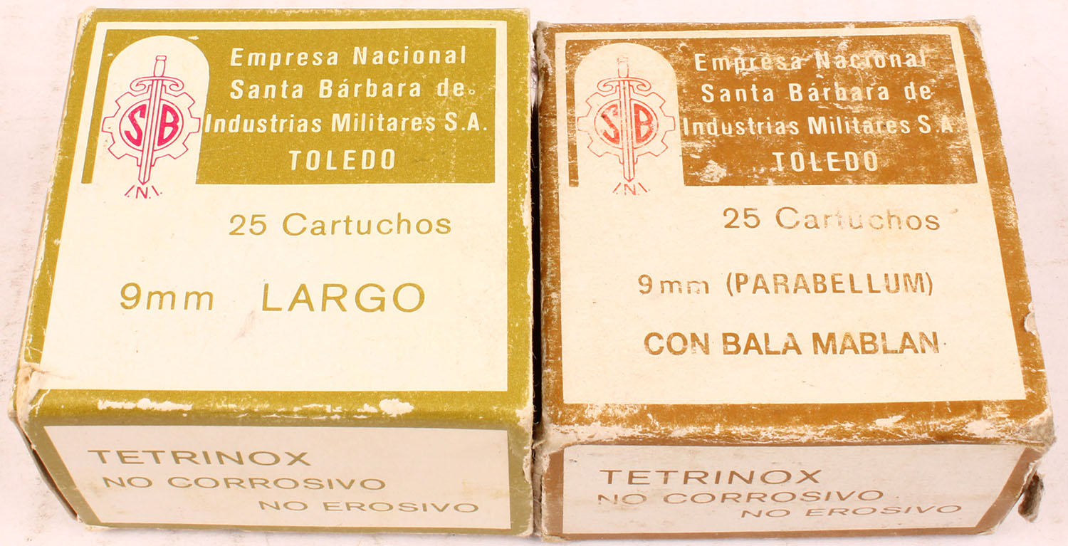 Santa Barbara, Lot of (2) - (1) box of 9mm Largo, (1) box of 9mm Parabellum, both boxes full, boxes are solid with very good to excellent color, ammo is excellent. Grade: Excellent - Value: 10 to 50