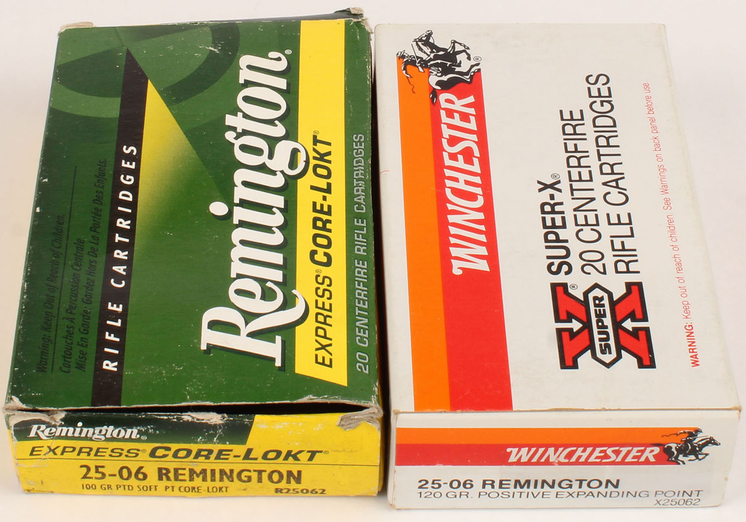Mixed Mfg., Lot of (2) .25-06 Remington, Win. Box is Full of incorrect ammo, Rem. Box is partial 17rds. Of incorrect ammo, boxes are solid with excellent color, ammo is excellent. Grade: Excellent - Value: 10 to 50