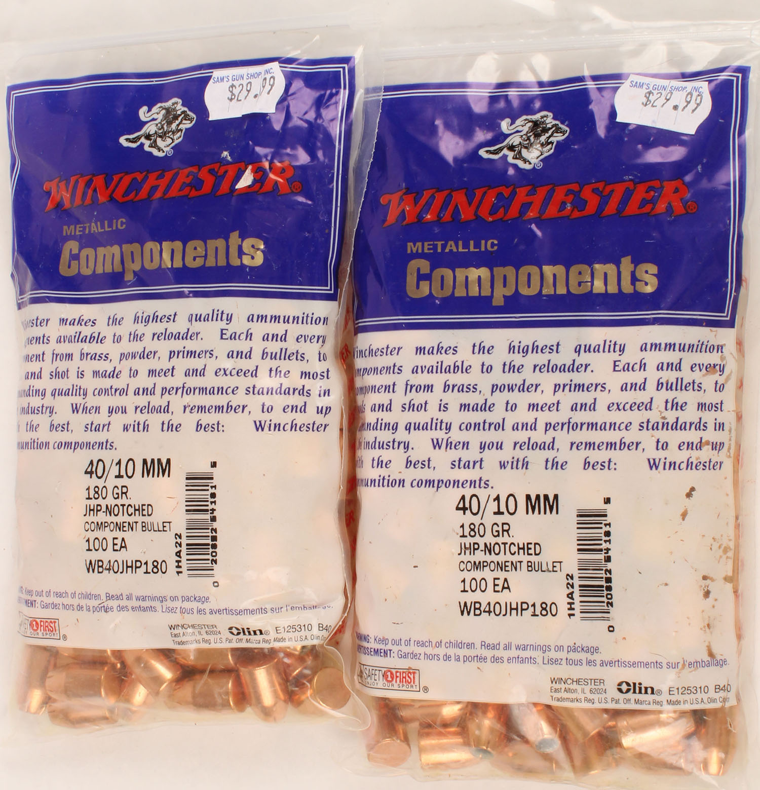 Winchester, Lot of (2) bags of .40 Cal./10mm, 180 Grain Jacketed Hollow Point, both bags of 100rds. are full & sealed. Grade: MINT - Value: 20 to 60
