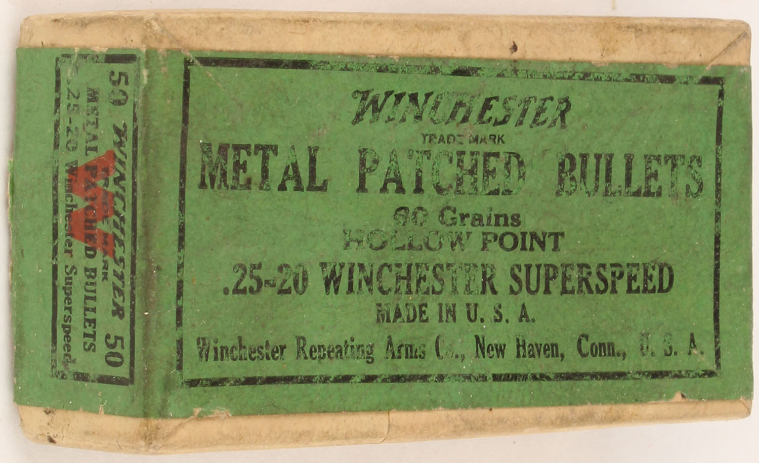 Winchester, SuperSpeed, .25-20, 60 Grain Hollow Point, Metal Patched Bullets, Partial 38rds., 2pc. Buff box with green wraparound label, box is solid with very good color, very minor age soiling, some shelf wear, very minor corner wear, edges are crisp, label is intact, ammo is excellent. Grade: Excellent - Value: 6 to 30