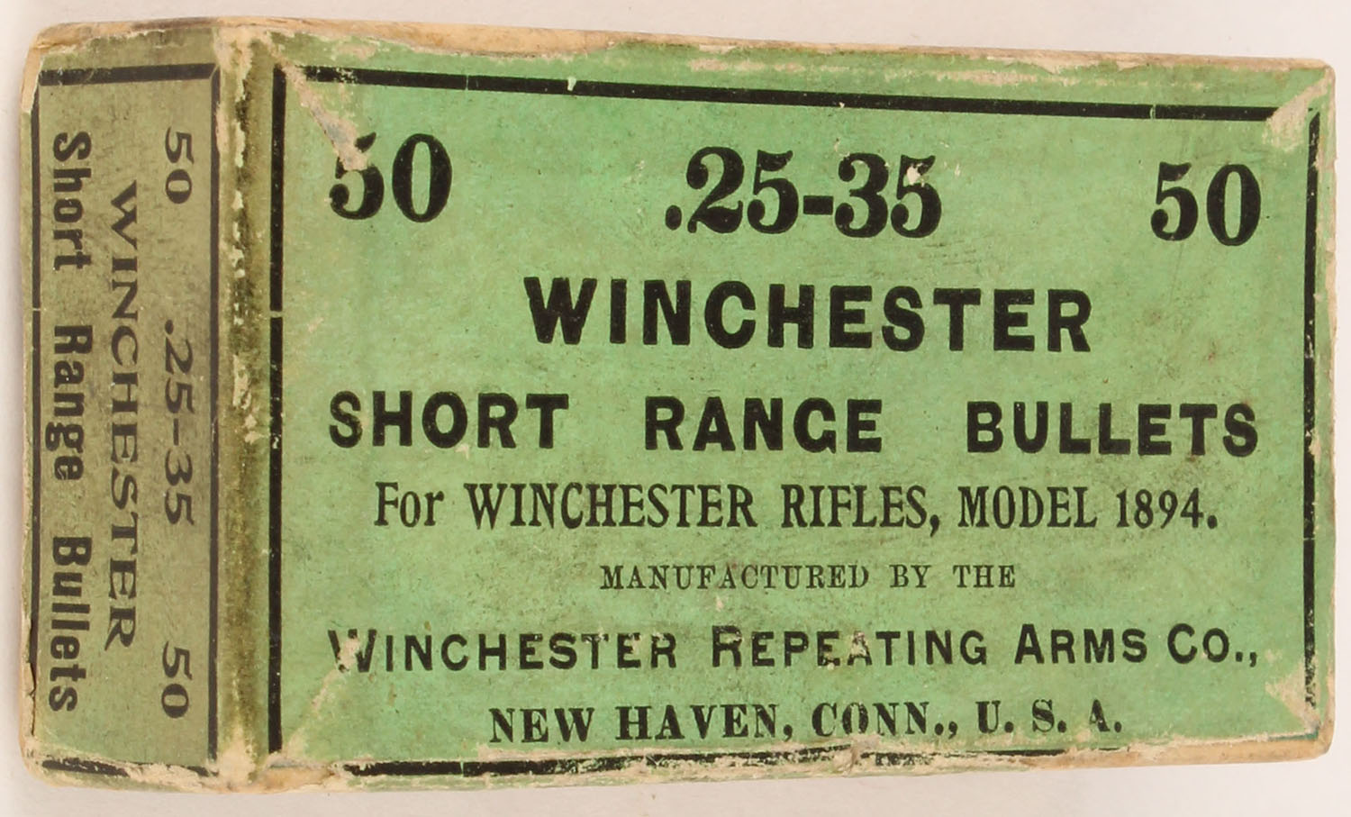 Winchester, .25-35, Short Range Bullets, Full, 2pc. Buff box with green label, box is solid with excellent color, minor age soiling, very minor edge & corner wear, label is intact, bullets are excellent. Grade: Excellent - Value: 20 to 60