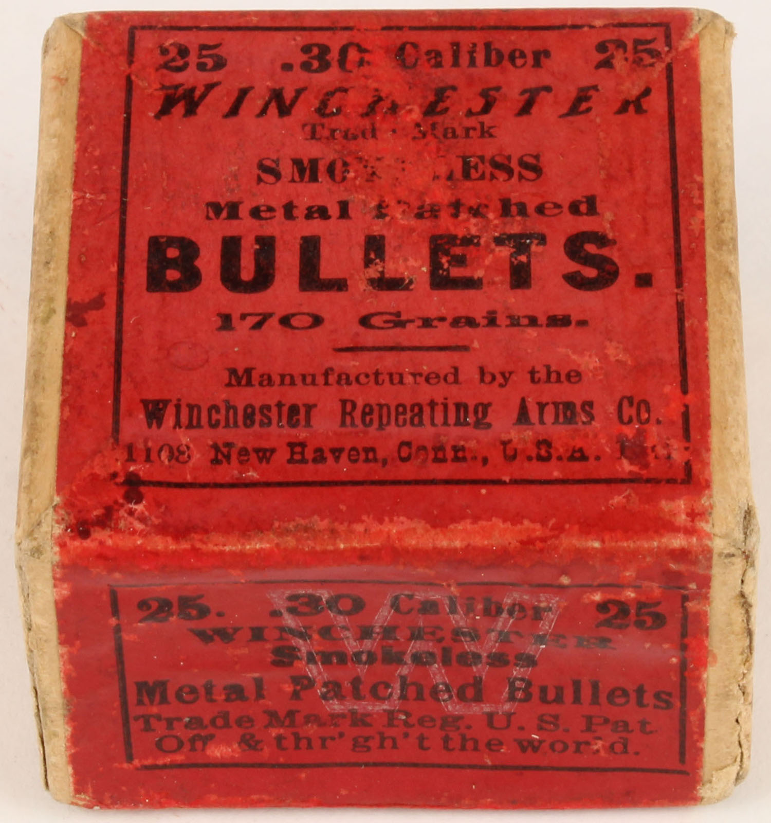 Winchester, Smokeless, .30 Caliber, 170 Grain Metal Patched Bullets, Full, 2pc. Buff box with red wraparound label, box is solid with very good color, some age soiling & shelf wear, some edge & corner wear, 2 vertical seam splits to both front corners of lid, label is intact, bullets are excellent. Grade: Very Good + - Value: 8 to 40