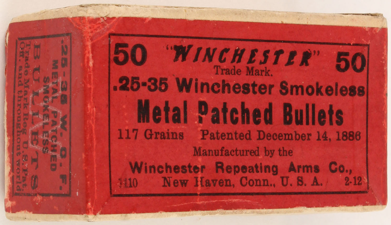 Winchester, Smokeless, .25-35, 117 Grain Metal Patched Bullets, Full, 2pc. Buff box with red wraparound label, box is solid with excellent color, some edge & corner wear, label is intact, bullets are excellent. Grade: Excellent + - Value: 20 to 60