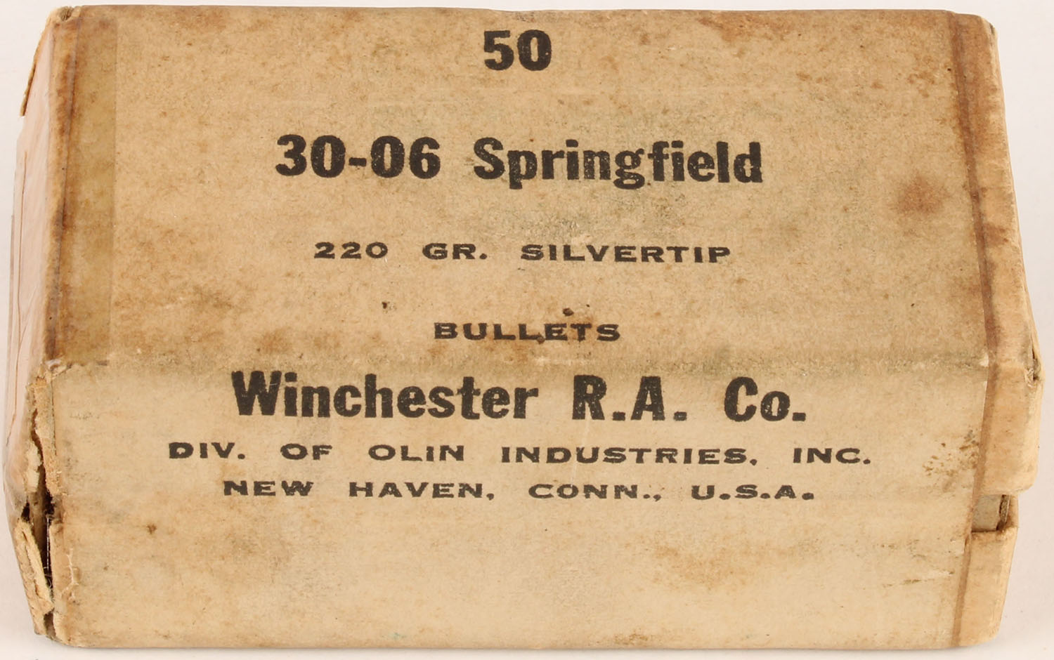 Winchester, .30-06 Springfield, 220 Grain Silvertip Bullets, FULL & SEALED, 2pc. Buff box with buff wraparound label, box is solid with very good color, age soiling, some corner wear, edges are mostly crisp, left end is taped, label is intact. Grade: Very Good + - Value: 10 to 50