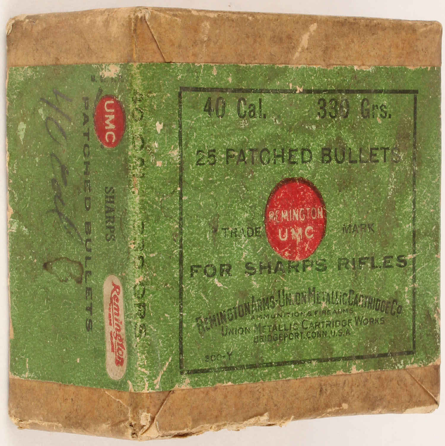 Remington UMC, 40 Cal., 330 Grs. Patched Bullets, Empty, 2pc. Buff box with green label, box has soiling & scuffing, label is intact. Grade: Very Good ++ - Value: 10 to 40