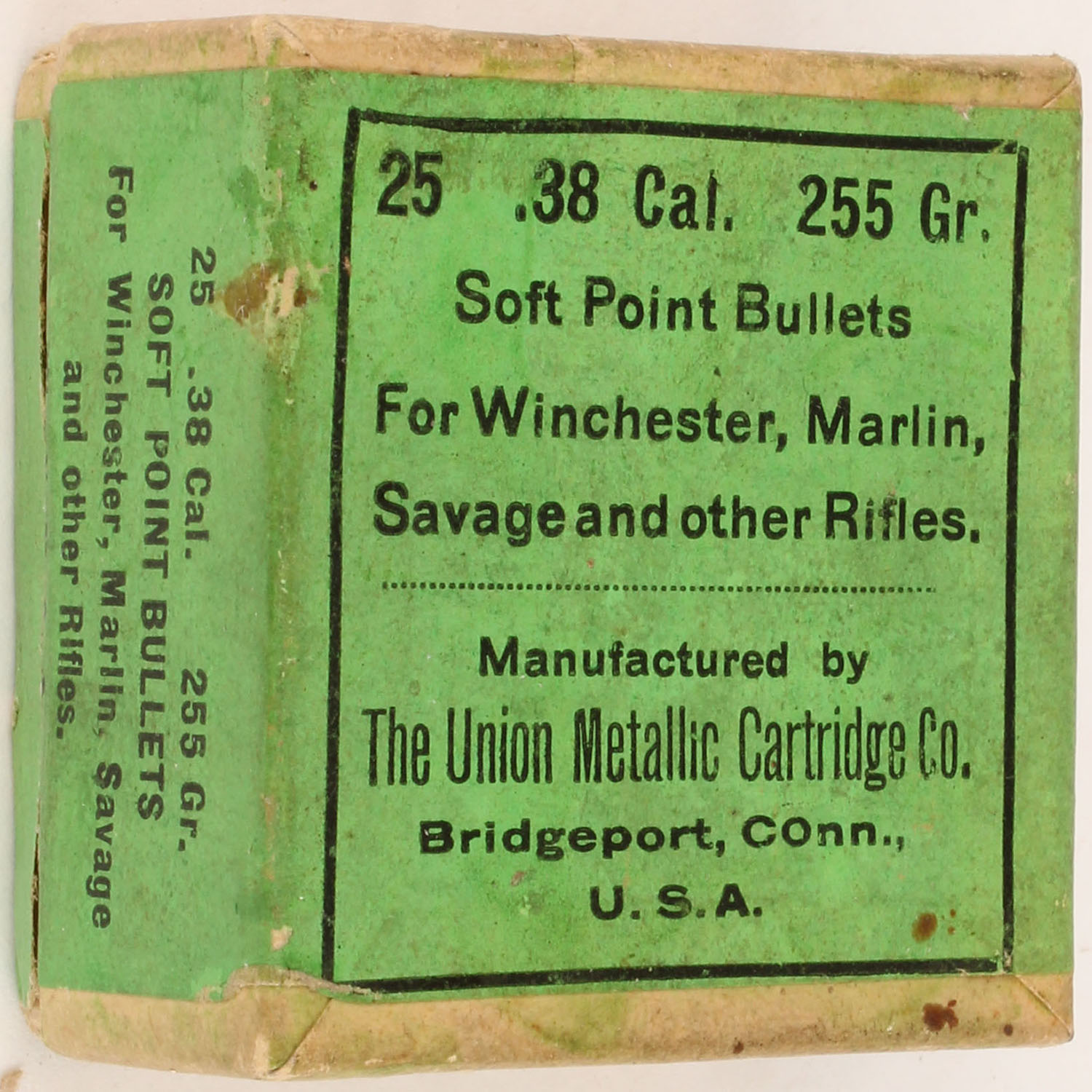 UMC, 38 Cal., 255 Grs. Soft Point Bullets, Full, 2pc. Buff box with green label, box is very solid with great color, label is intact. Grade: Excellent + - Value: 10 to 40