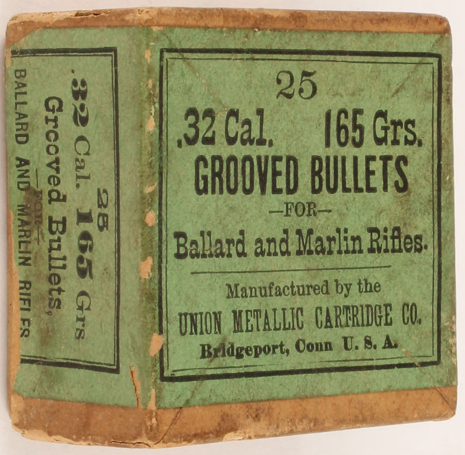 UMC, 32 Cal., 165 Grs. Grooved, Full with mixed bullets, 2pc. Buff box with green label, box has seam split & light soiling, label is intact. Grade: Very Good ++ - Value: 10 to 40