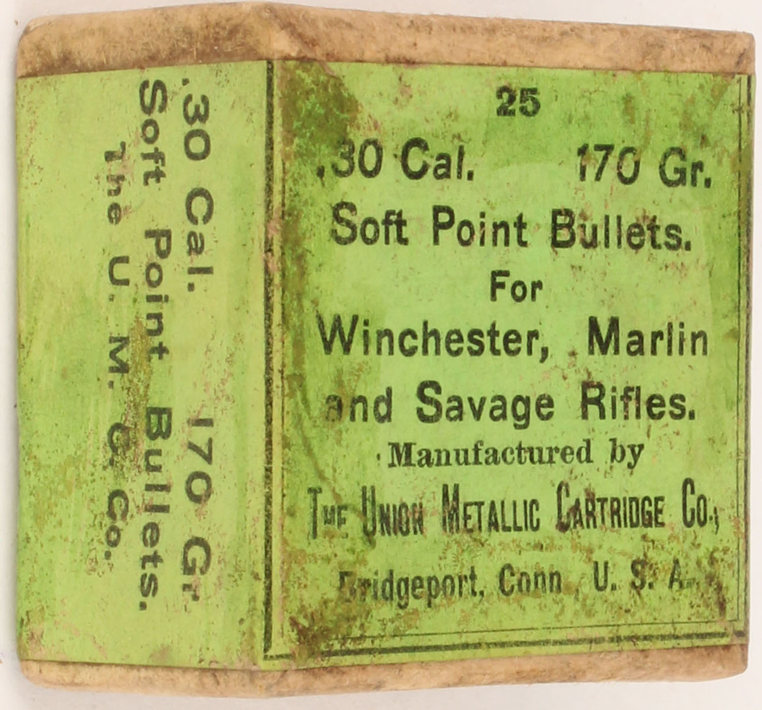 UMC, 30 Cal., 170 Grs. Soft Point Bullets, FULL & SEALED, 2pc. Buff box with green label, box is very solid with great color & light soiling, label is intact. Grade: Excellent + - Value: 10 to 40