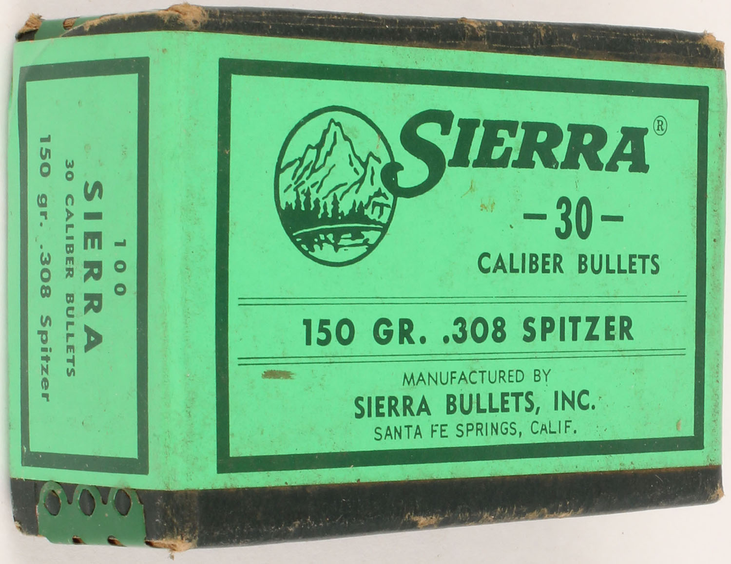 Sierra, 30 Cal., 150 GR. Spitzer, FULL & SEALED, 1pc., green box, box is solid with excellent color. Grade: Excellent - Value: 10 to 40