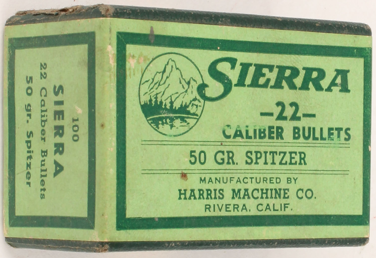 Sierra, 22 Cal., 50 GR. Spitzer, Full, 2pc., green box, box is solid with excellent color, bullets are excellent. Grade: Excellent + - Value: 10 to 40