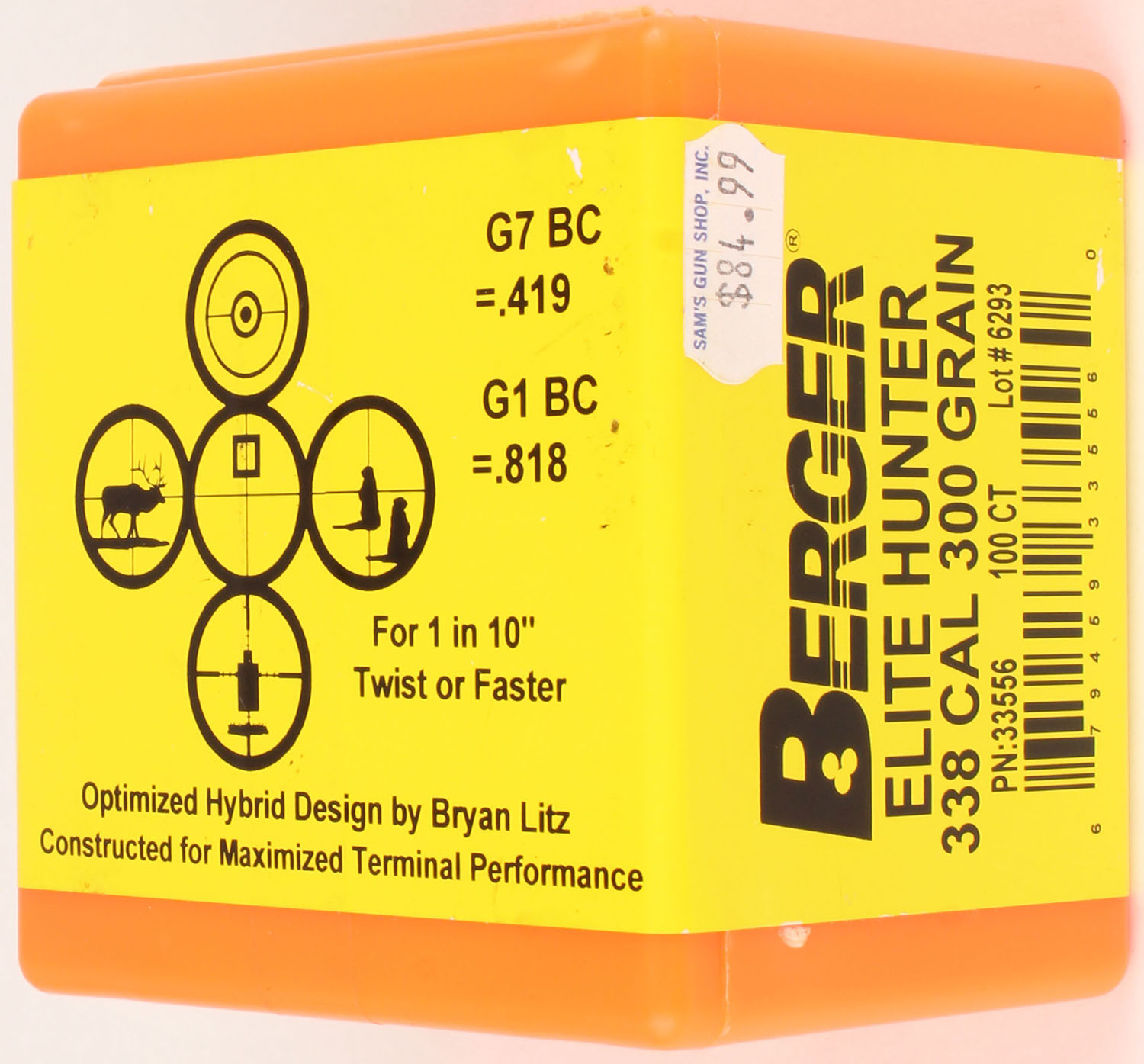 Berger, Elite Hunter, 338 Cal., 300 GR., FULL & SEALED, 1pc., orange plastic box with yellow & black label, box is solid with excellent color. Grade: Excellent ++ - Value: 10 to 40