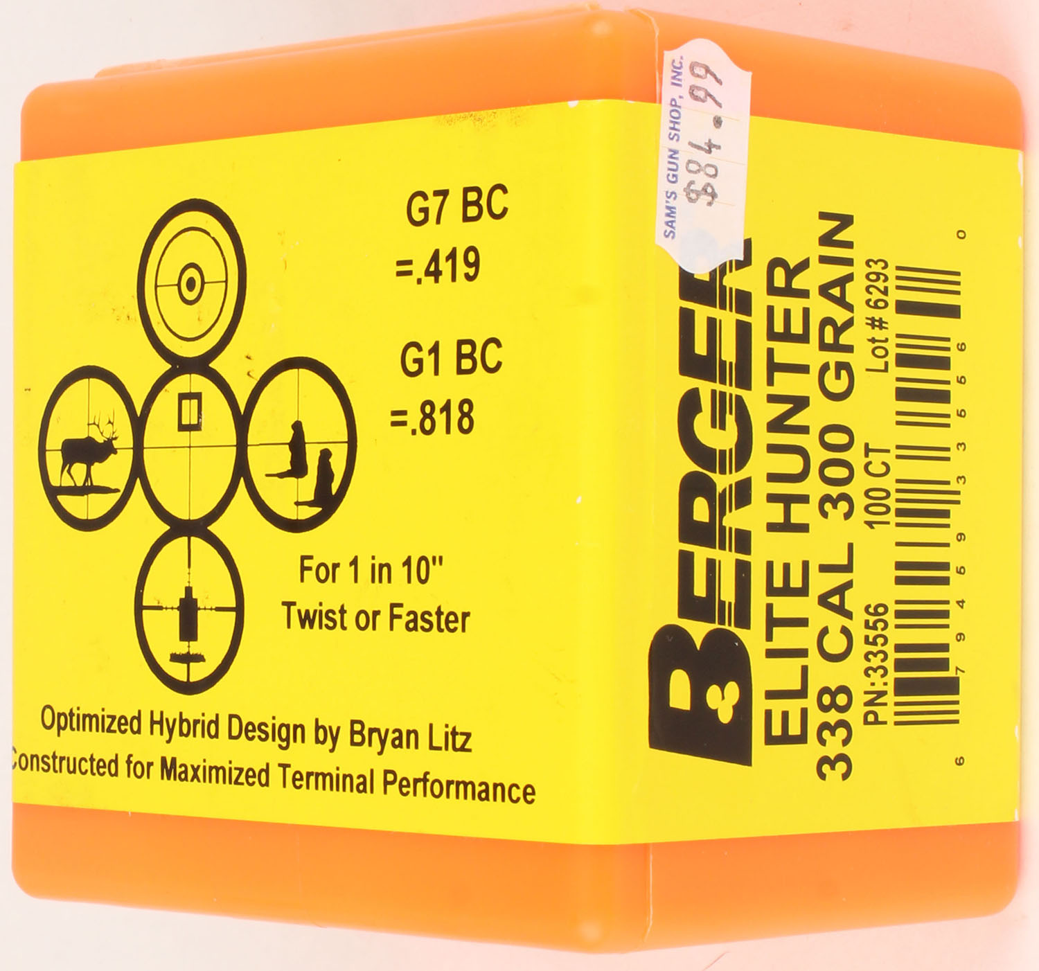 Berger, Elite Hunter, 338 Cal., 300 GR., FULL & SEALED, 1pc., orange plastic box with yellow & black label, box is solid with excellent color. Grade: Excellent ++ - Value: 10 to 40