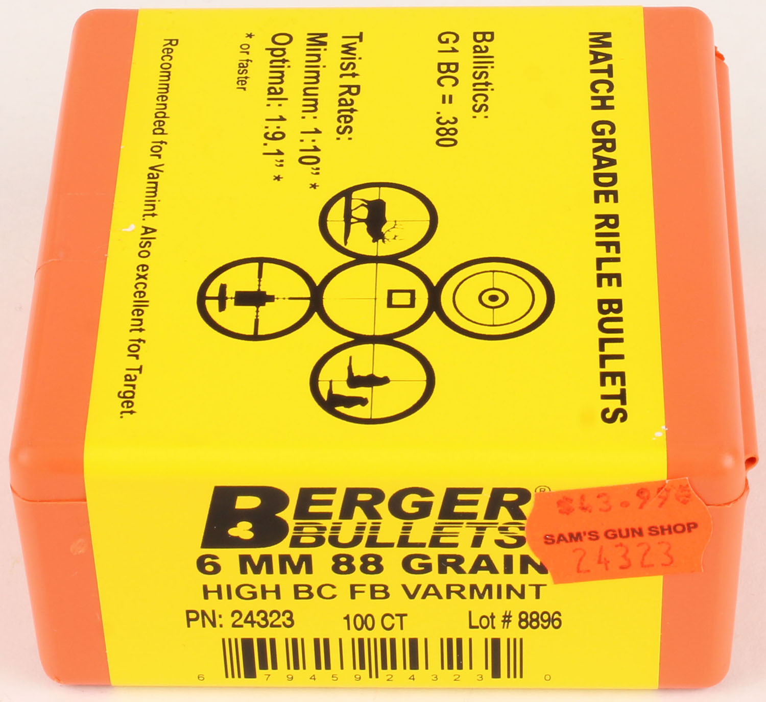 Berger, Match Grade Rifle Bullets, 6mm, 88 GR. High BC FB Varmint, FULL & SEALED, 1pc. Orange plastic box, box is MINT with minty color. Grade: MINT - Value: 10 to 40