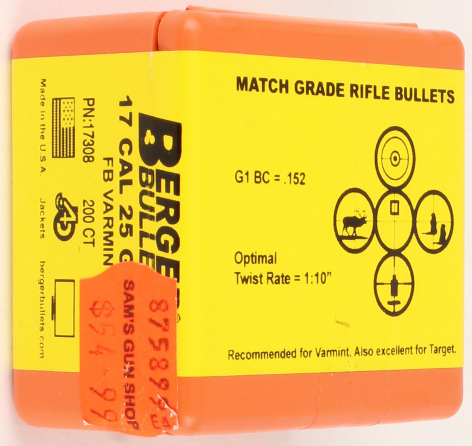 Berger, Match Grade Rifle Bullets, 17 cal., 25 GR. FB Varmint, FULL & SEALED, 1pc. Orange plastic box, box is MINT with minty color. Grade: Excellent + - Value: 10 to 40