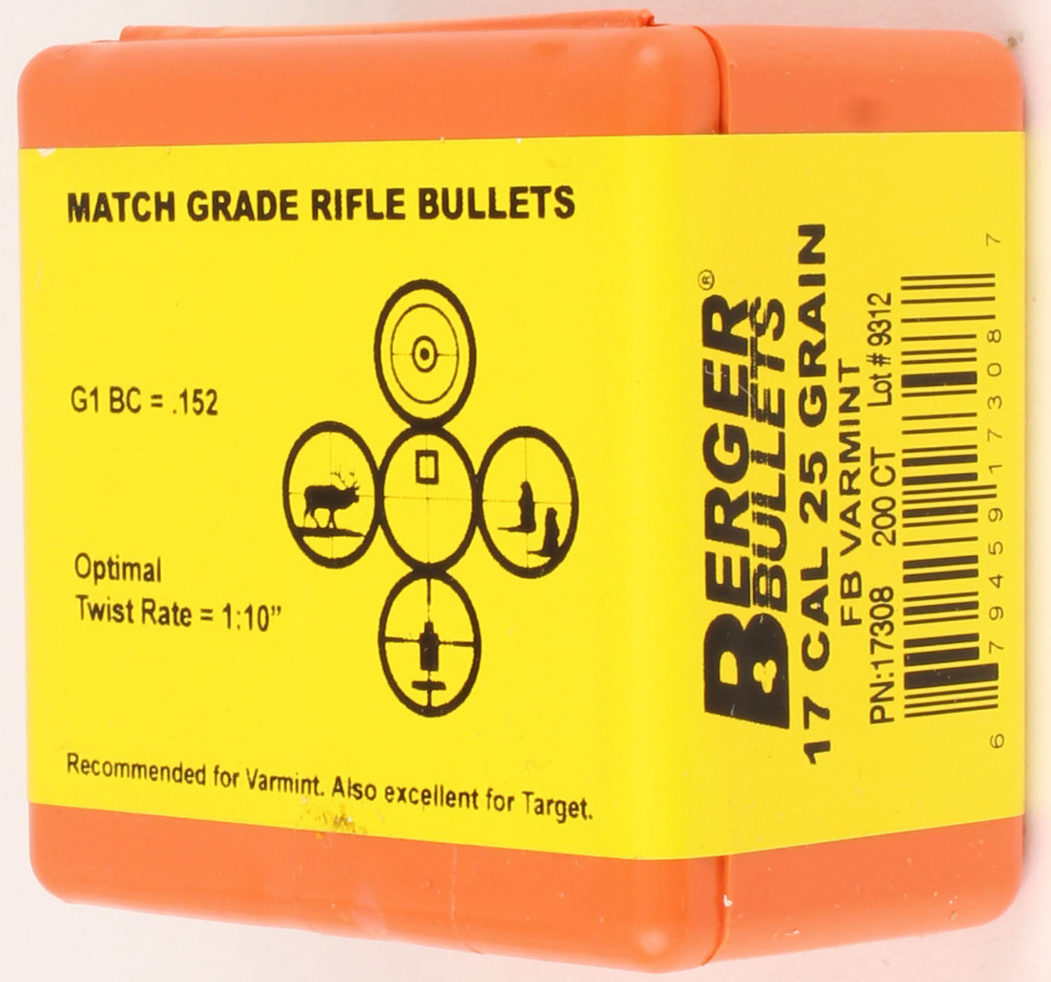 Berger, Match Grade Rifle Bullets, 17 cal., 25 GR. FB Varmint, FULL & SEALED, 1pc. Orange plastic box, box is MINT with minty color. Grade: Excellent + - Value: 10 to 40
