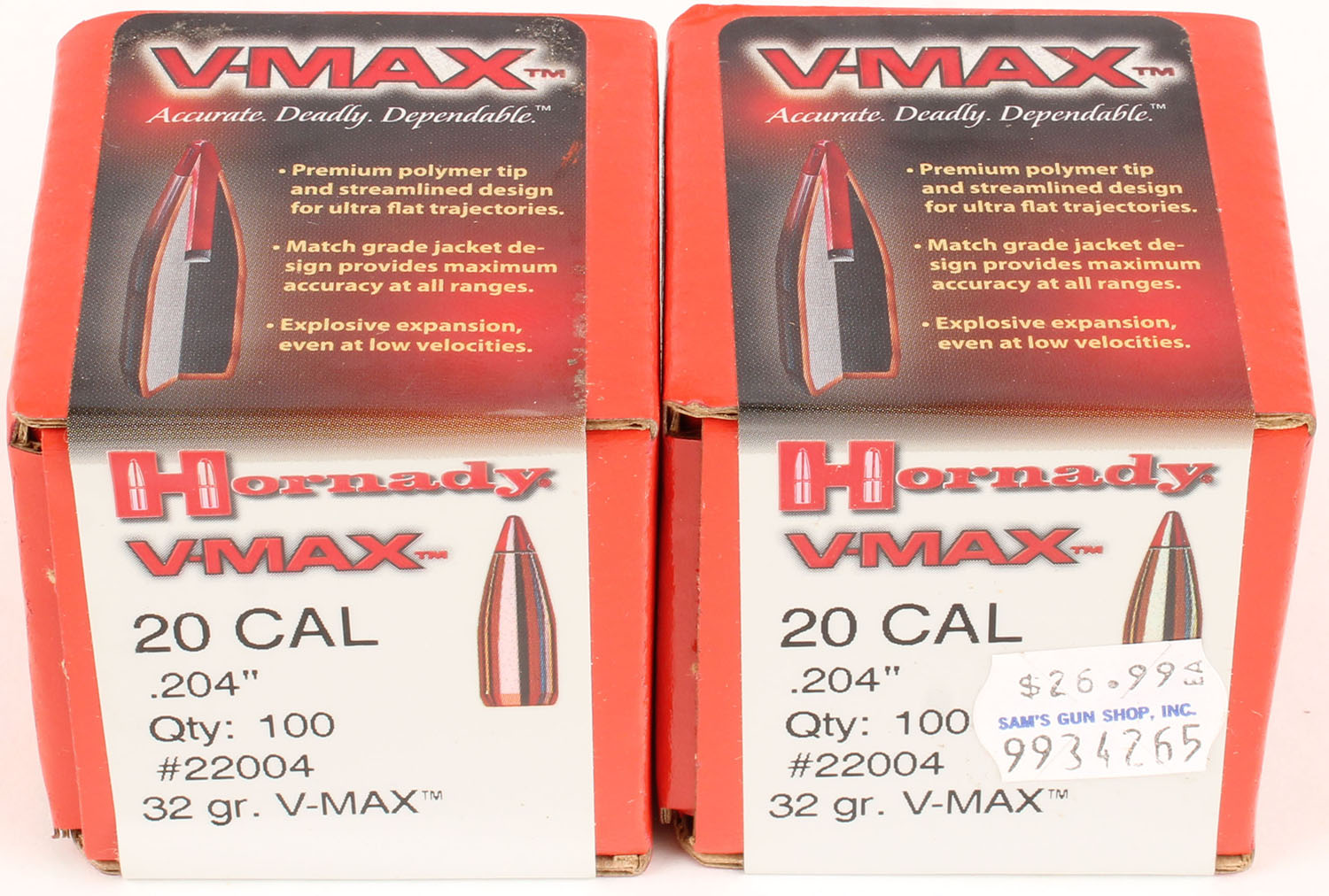 Lot of 2 Hornady, 20 Cal., 32 Grs. V-Max, FULL & SEALED, 1pc., Multi-colored box, box is excellent with great color. Grade: Excellent ++ - Value: 10 to 60