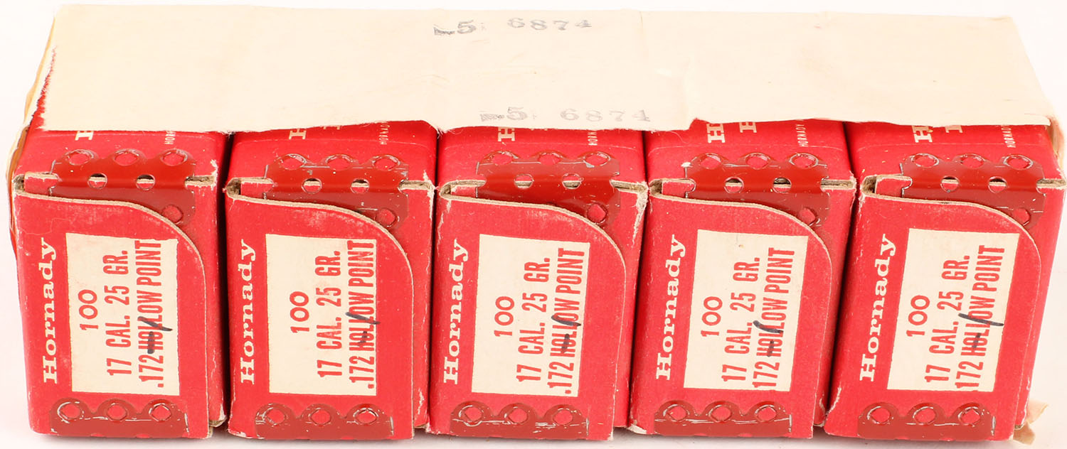 Lot of 5 Hornady with paper wrap, 17 Cal., 25 Grs. HP, Full, 1pc., Multi-colored box, box is excellent with great color. Grade: Excellent - Value: 20 to 60