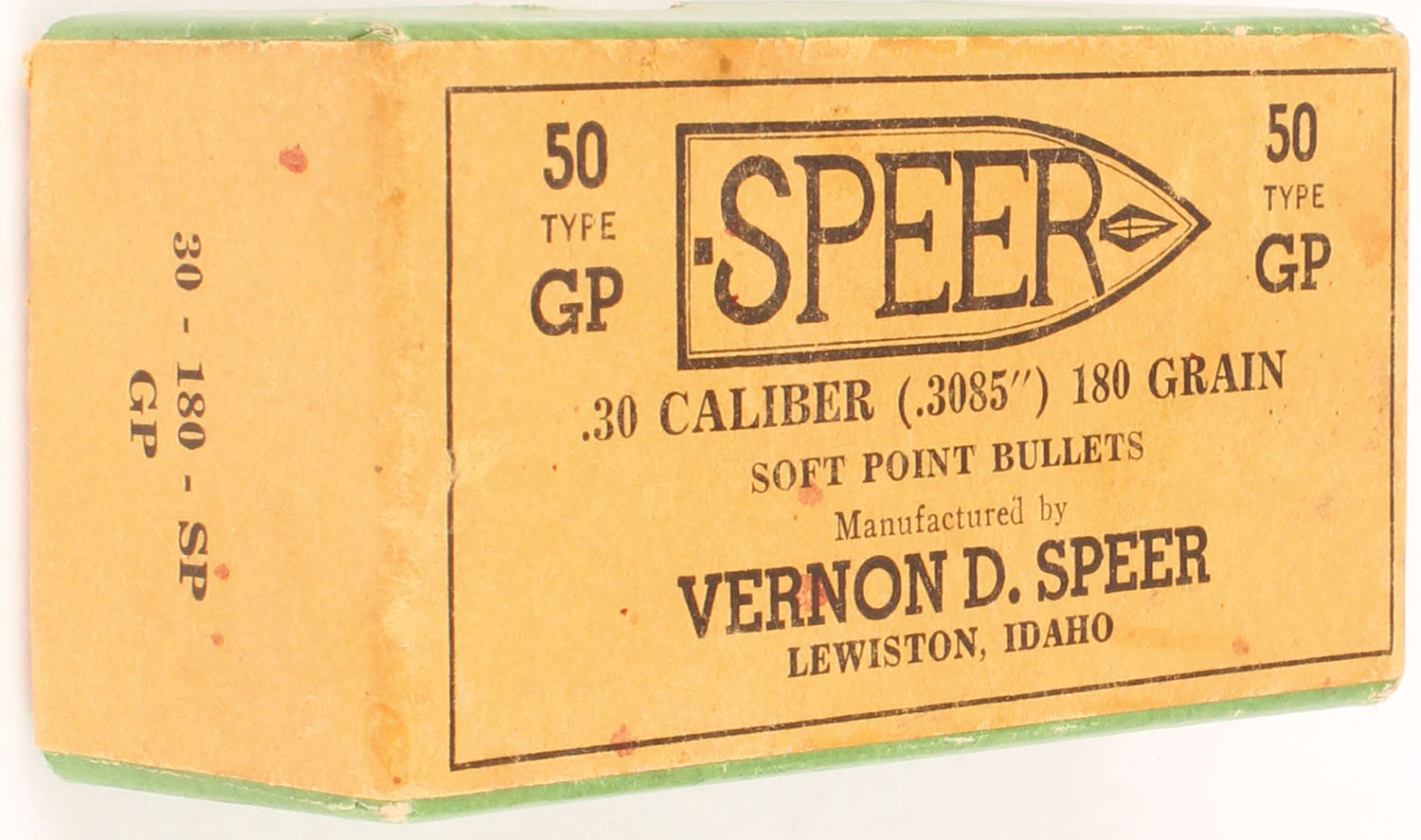 Speer, 30 Cal., 180 Grs. SP GP, Empty, 1pc., Multi-colored box, box is excellent with great color. Grade: Excellent - Value: 10 to 60